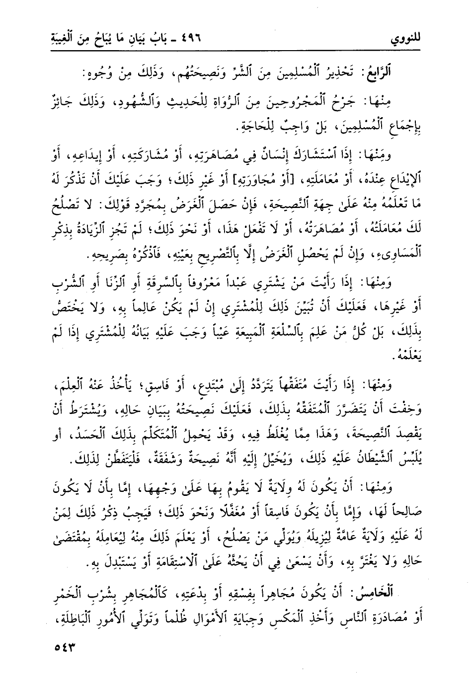 ومنها: إذا استشارك إنسانٌ في مصاهرته، أو مشاركته، أو إيداعهِ، أو الإِيداع عندهُ، أو معاملته، [أو مجاورته] أو غير ذلك؛ وجب عليك أن تذكُر له ما تعلمهُ منهُ على جهةِ النصيحةِ، فإن حصلَ الغرضُ بمجرّد قولك: لا تصلحُ لك معاملتُه، أو مصاهرتهُ، أو لا تفعلْ هذا، أو نحو ذلك؛ لم تجز الزيادةُ بذكرِ المساوئ، وإن لم يحصل الغرضُ إلا بالتصريح بعينه، فاذكره بصريحه.