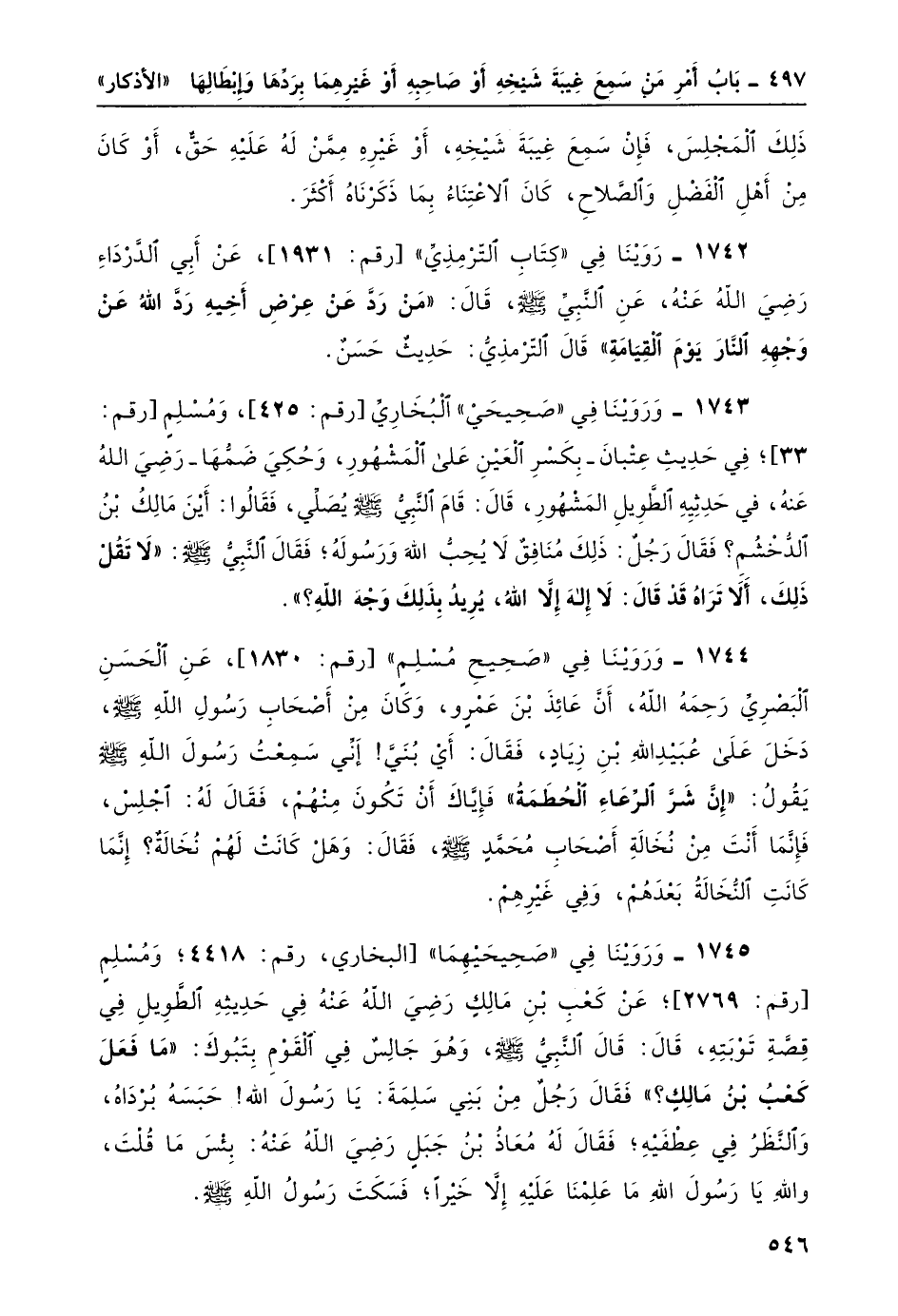 1745- وَرَوَيْنَا في "صحيحيهما" البخاري، [رقم: 4418] ؛ ومسلمٍ [رقم: 2769] ؛ عن كعب بن مالكٍ رضي الله عنهُ في حديثهِ الطويل في قصة توبته، قال: قال النبيّ صلى الله عليه وسلم، وهو جالسٌ في القوم بتبوك: "ما فَعَلَ كَعْبُ بْنُ مالِكٍ"؟ فقال رجلٌ من بني سَلمة: يا رسول الله! حبسَه بُرْدَاهُ، والنظرُ في عِطفيه؛ فقال له معاذُ بن جبل رضي الله عنهُ: بئسَ ما قلتَ، واللهِ يا رسولَ الله ما علمنا عليهِ إلا خيراً؛ فسكتَ رسول الله صلى الله عليه وسلم.