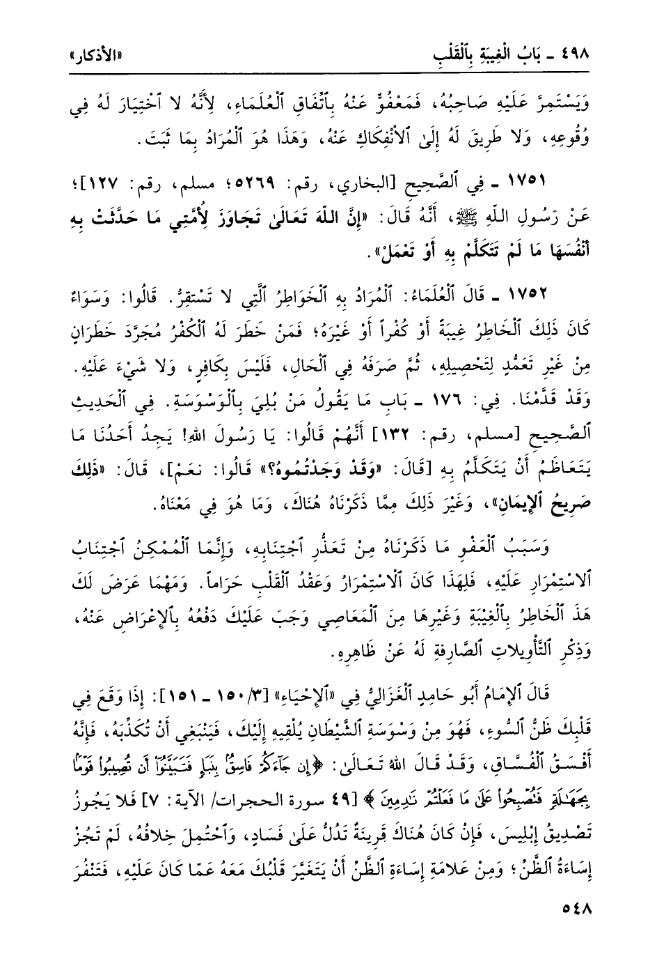 وسببُ العفو ما ذكرناه من تعذّرٍ اجتنابه، وإنما الممكن اجتناب الاستمرار عليه، فلهذا كان الاستمرارُ وعقدُ القلبِ حراماً. ومهما عرض لك هذ الخاطرُ بالغيبةِ وغيرها من المعاصي وجبَ عليك دفعهُ بالإعراضِ عنهُ، وذكرِ التأويلاتِ الصارفة لهُ عن ظاهره.