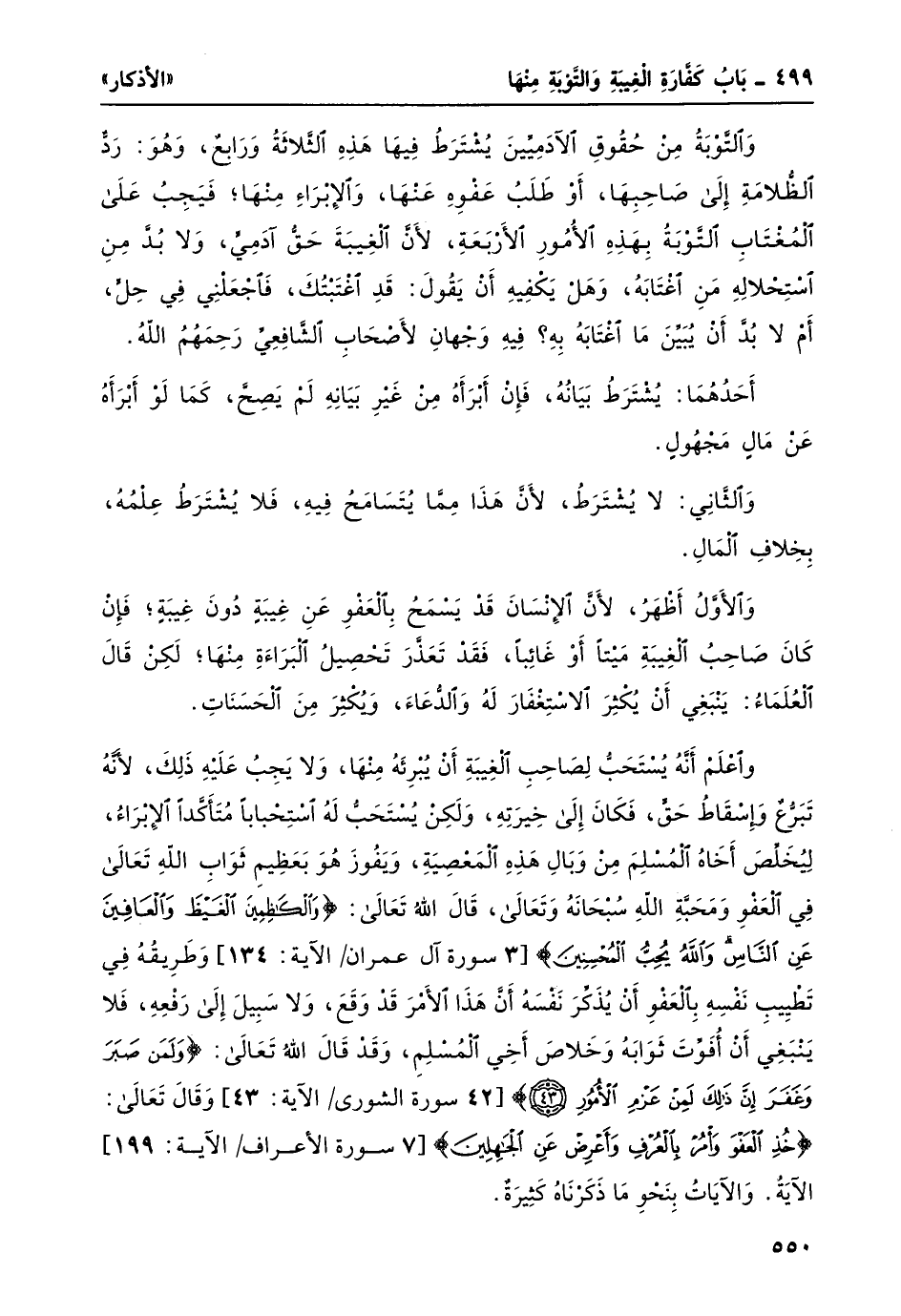 واعلم أنه يُستحبّ لصاحب الغِيبة أن يبرئه منها، ولا يحبُ عليه ذلك؛ لأنه تبرّعٌ وإسقاطُ حقٌ، فكان إلى خِيرَته، ولكن يُستحبّ له استحباباً متأكداً الإِبراء، ليخلِّصَ أخاهُ المسلم من وبال هذه المعصية، ويفوزَ هُو بعظيم ثواب الله تعالى في العفو ومحبة الله سبحانه وتعالى، قال الله تعالى: {وَالْكَاظِمِينَ الْغَيْظَ وَالْعَافِينَ عَنِ النَّاسِ وَاللَّهُ يُحِبُّ الْمُحْسِنِينَ} [آل عمران: 134] وطريقهُ في تطيب نفسه بالعفو أن يذكِّرَ نفسَه أنَّ هَذَا الأمْرَ قد وقعَ، ولا سبيلَ إلى رفعه، فلا ينبغي أن أُفوِّتَ ثوابهُ وخلاصَ أخي المسلم، وقد قال الله تعالى: {وَلَمَنْ صَبَرَ وَغَفَرَ إِنَّ ذَلِكَ لَمِنْ عَزْمِ الْأُمُورِ} [الشورى: 43] وقال تعالى: {خُذِ الْعَفْوَ وَأْمُرْ بِالْعُرْفِ وَأَعْرِضْ عَنِ الْجَاهِلِينَ} [الأعراف: 199] الآية. والآياتُ بنحو ما ذكرناهُ كثيرةٌ.