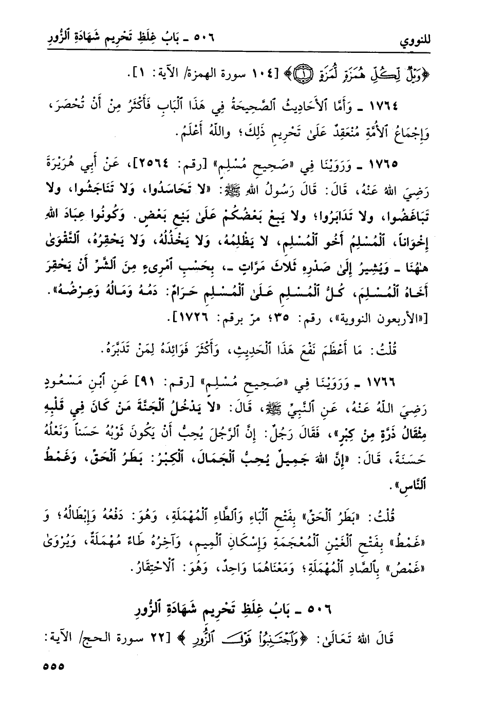 1766- وَرَوَيْنَا في "صحيح مسلم" [رقم: 91] عن ابن مسعودٍ رضي الله عنهُ، عن النبي صلى الله عليه وسلم، قال: "لا يدخلُ الجنة مَنْ كانَ في قَلْبِهِ مثقالُ ذرةٍ مِنْ كِبْرٍ"، فقال رجلٌ: إن الرجلَ يُحبّ أن يكون ثوبهُ حسناً ونعلهُ حسنةً، قال: "إنَّ اللَّهَ جميلٌ يحبُ الجَمالَ، الكبرُ: بطرُ الحَقِّ، وغمطُ الناسِ".