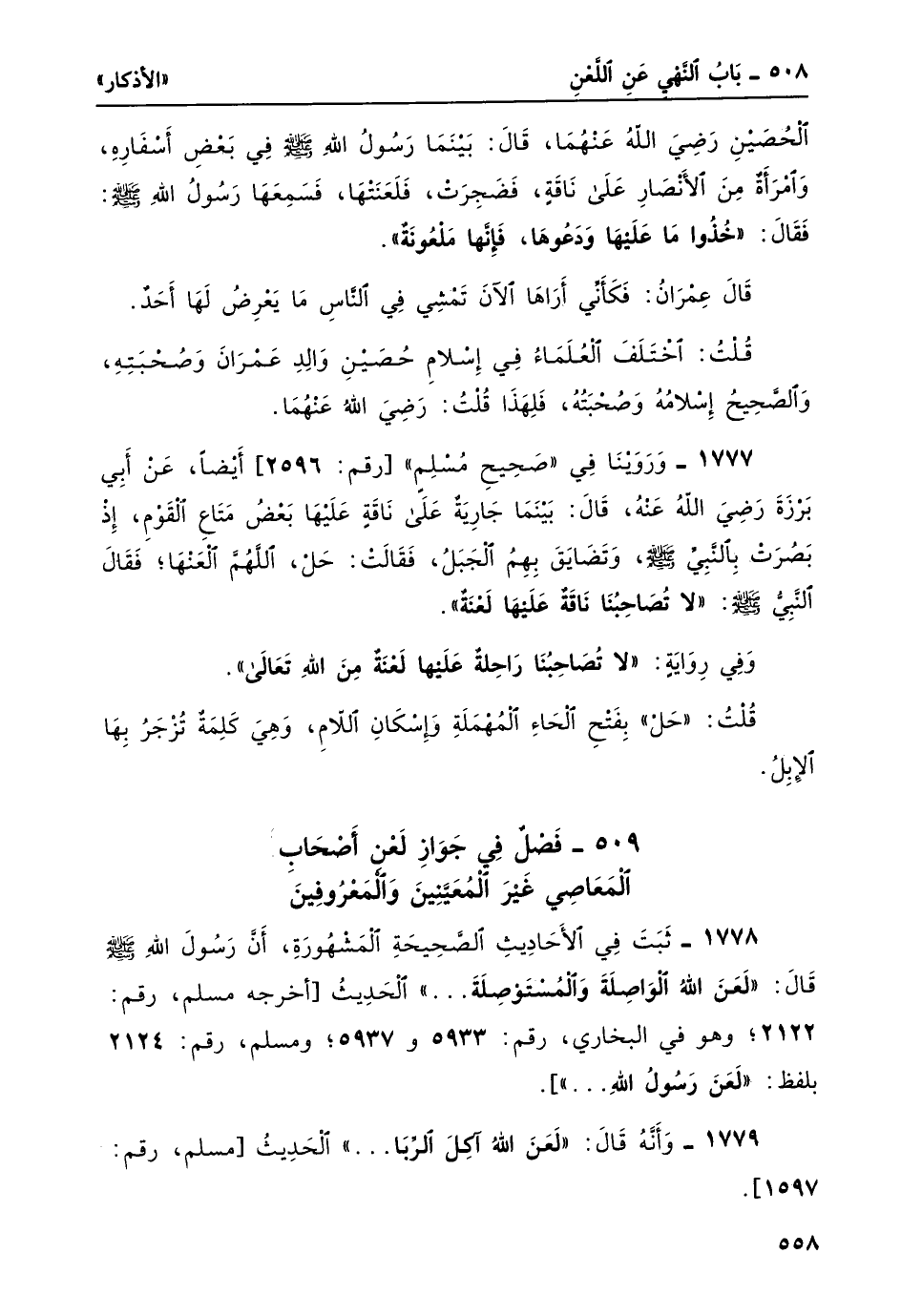 1777- وَرَوَيْنَا في "صحيح مسلم" [رقم: 2596] أيضاً، عن أبي برزة رضي اللهُ عنهُ، قال: بينما جاريةٌ على ناقةٍ عليها بعضُ متاعِ القومِ، إذ بصرتْ بالنبيّ صلى الله عليه وسلم، وتضايقَ بهمُ الجبلُ، فقالت: حَلْ، اللَّهمّ العنها؛ فقال النبي صلى الله عليه وسلم: "لا تُصَاحِبُنا ناقةٌ عَلَيْها لعنةٌ".
