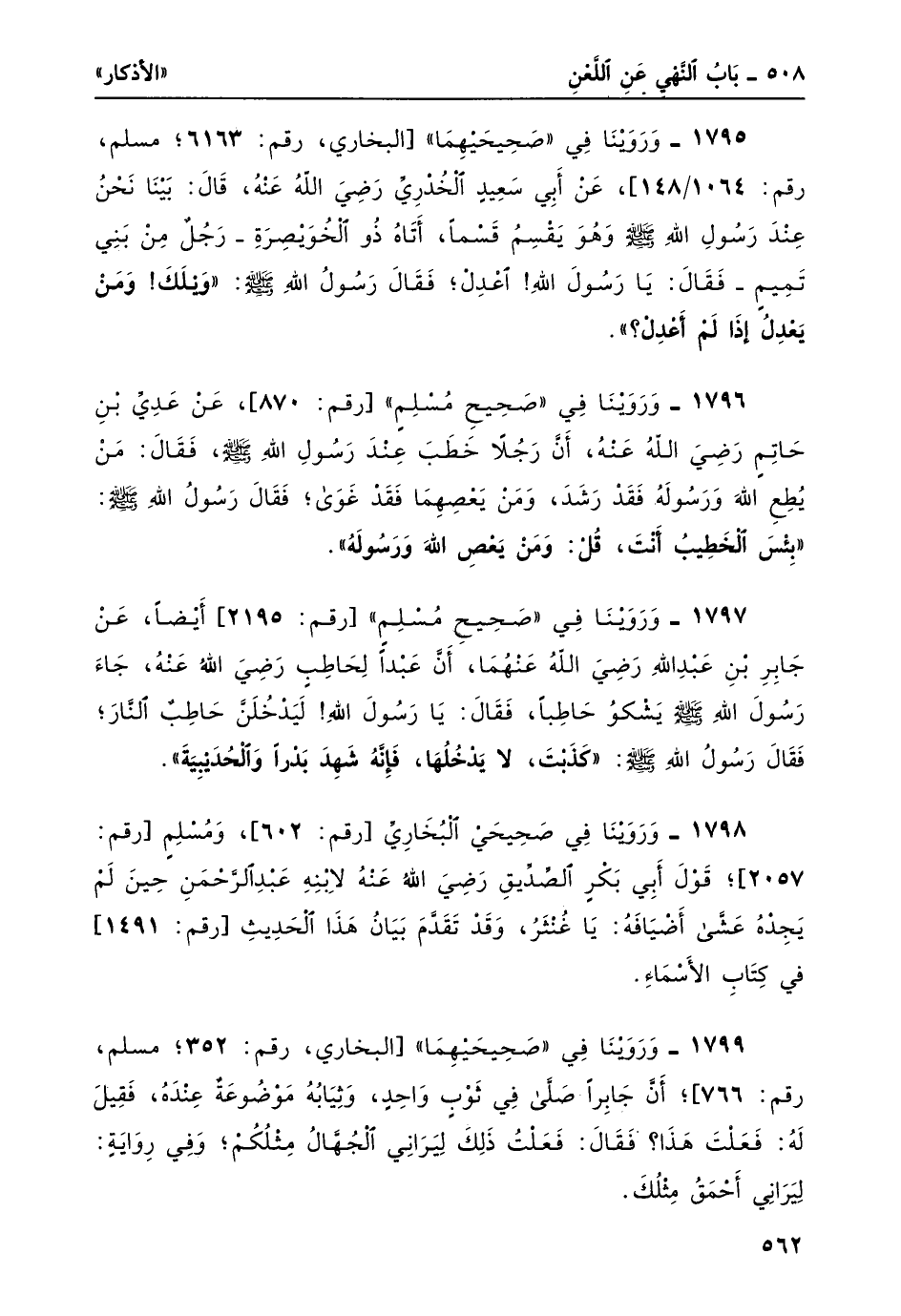 1798- وَرَوَيْنَا في صحيحي البخاري [رقم: 602] ، ومسلم [رقم: 2057] ؛ قولَ أبي بكرٍ الصديق رضي الله عنهُ لابنه عبد الرحمن حين لم يجده عَشَّى أضيافه: يا عنثرُ، وقد تقدم بيان هذا الحديث [رقم: 1491] في كتاب الأسماء.