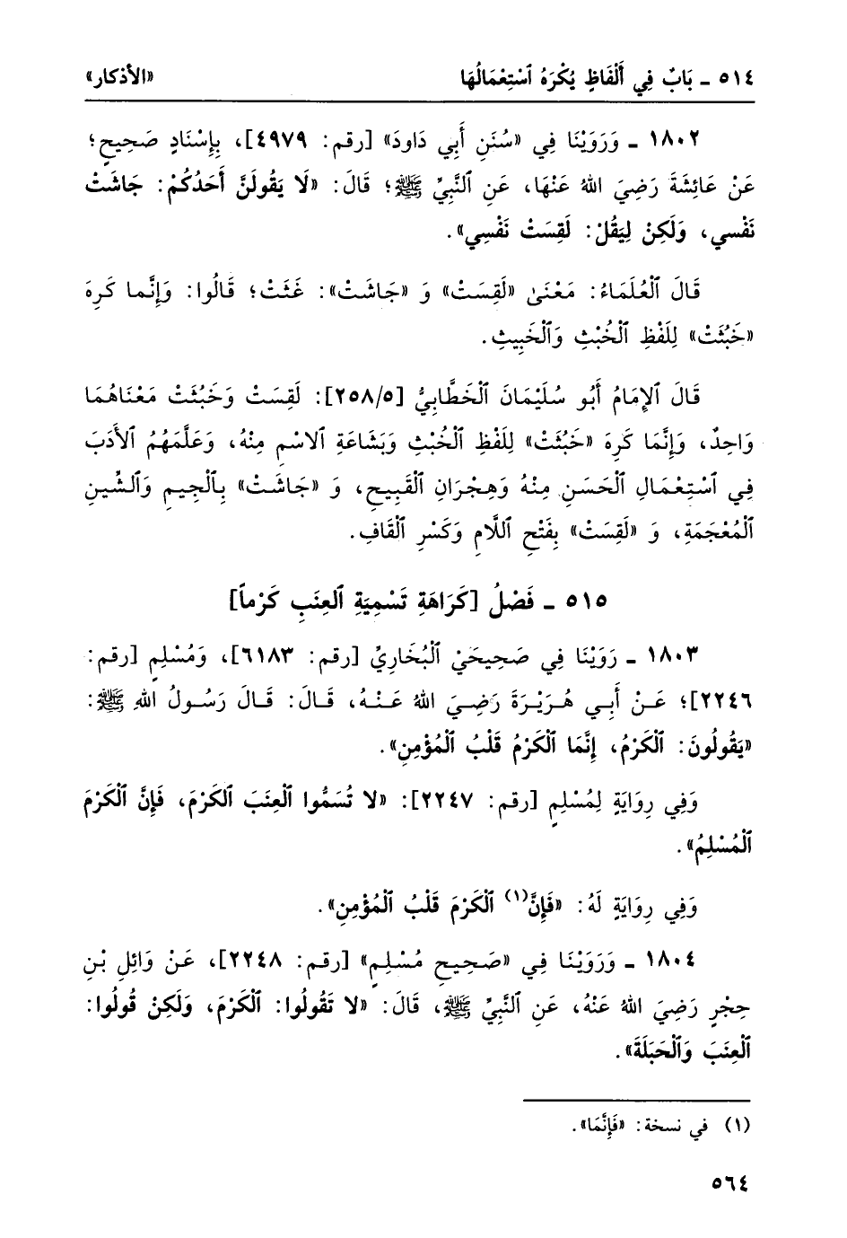 1804- وَرَوَيْنَا في "صحيح مسلم" [رقم: 2248] ، عن وائلَ بن حِجر رضي الله عنهُ، عن النبي صلى الله عليه وسلم، قال: "لا تَقُولُوا: الكَرْمَ، وَلَكِنْ قُولُوا: العِنَبَ والحَبَلَة".