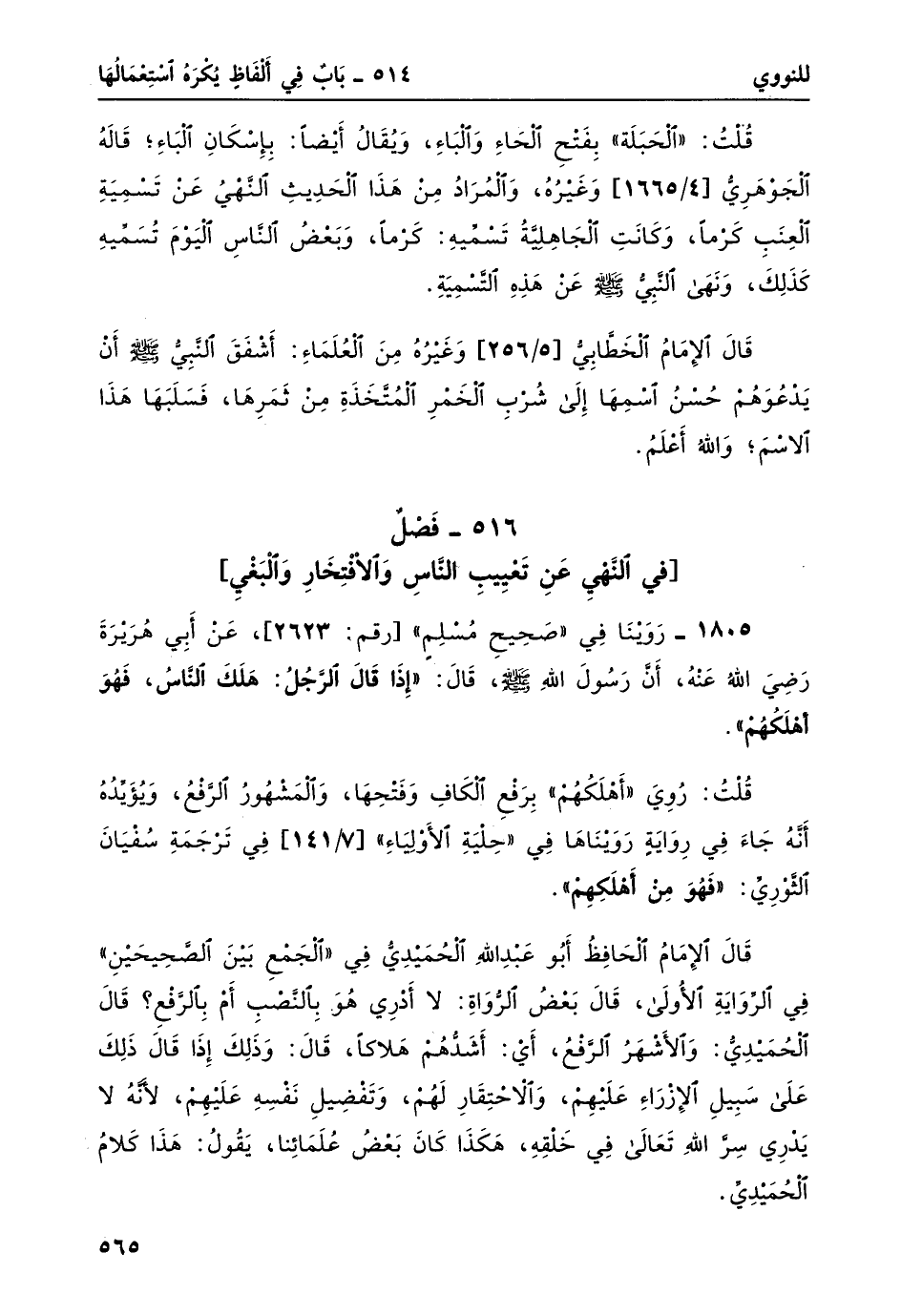 1805- رَوَيْنَا في "صحيح مسلم" [رقم: 2623] ، عن أبي هريرة رضي الله عنهُ، أن رسول الله صلى الله عليه وسلم، قال: "إِذَا قالَ الرجلُ: هَلَكَ النَّاسُ، فَهُوَ أهْلَكُهُمْ".