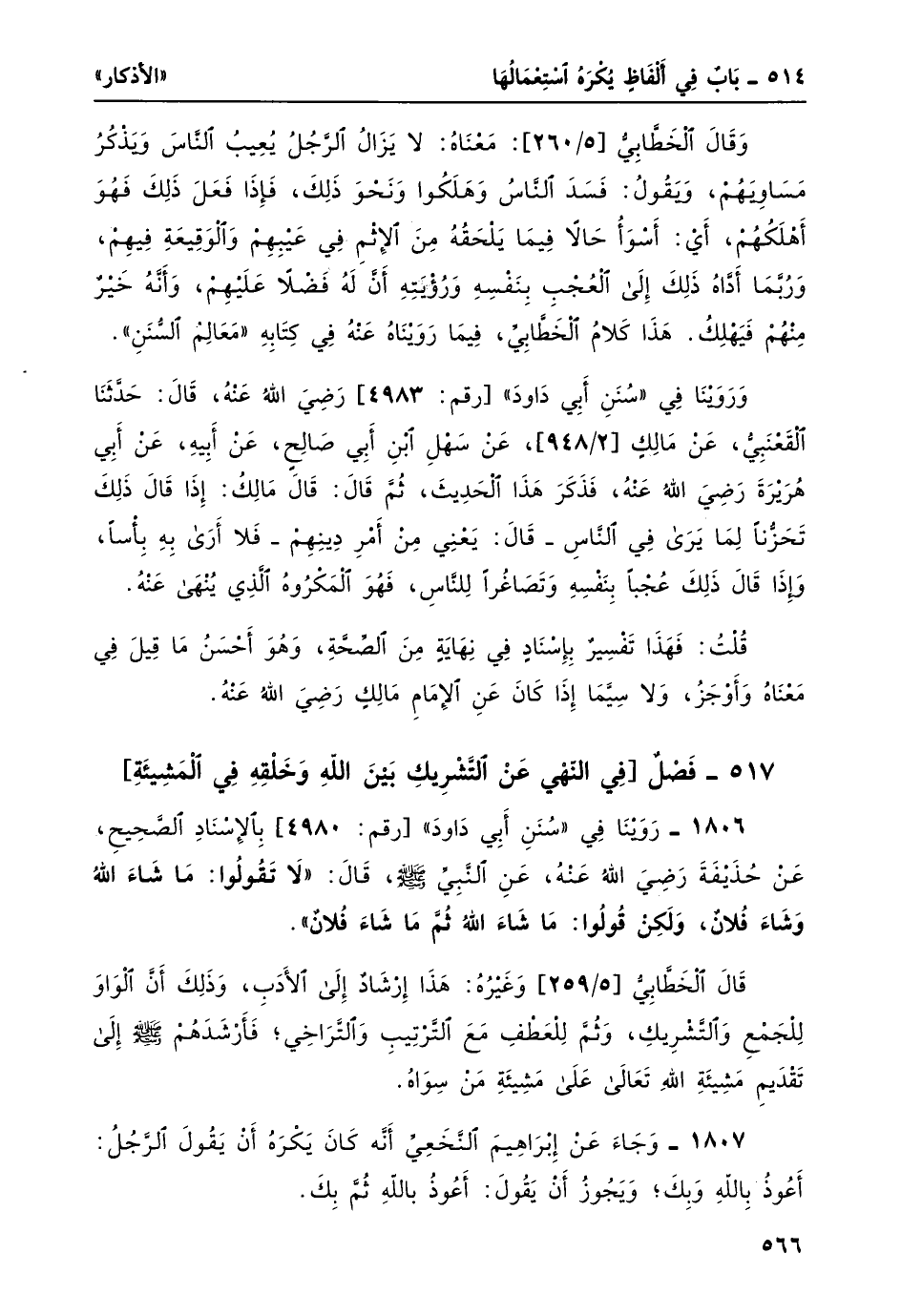 وَرَوَيْنَا في "سنن أبي داود" [رقم: 4983] رضي الله عنهُ، قال: حدّثنا القعنبي، عن مالك [2/ 948] ، عن سهلِ ابن أبي صالحٍ، عن أبيهِ، عن أبي هريرة رضي الله عنهُ، فذكر هذا الحديث، ثم قال: قال مالكُ: إذا قال ذلك تحزناً لما يرى في الناس -قال: يعني من أمرِ دينهم- فلا أرى به بأساً، وإذا قال ذلك عجباً بنفسهِ وتصاغراً للناس، فهو المكروه الذي يُنْهَى عنه.