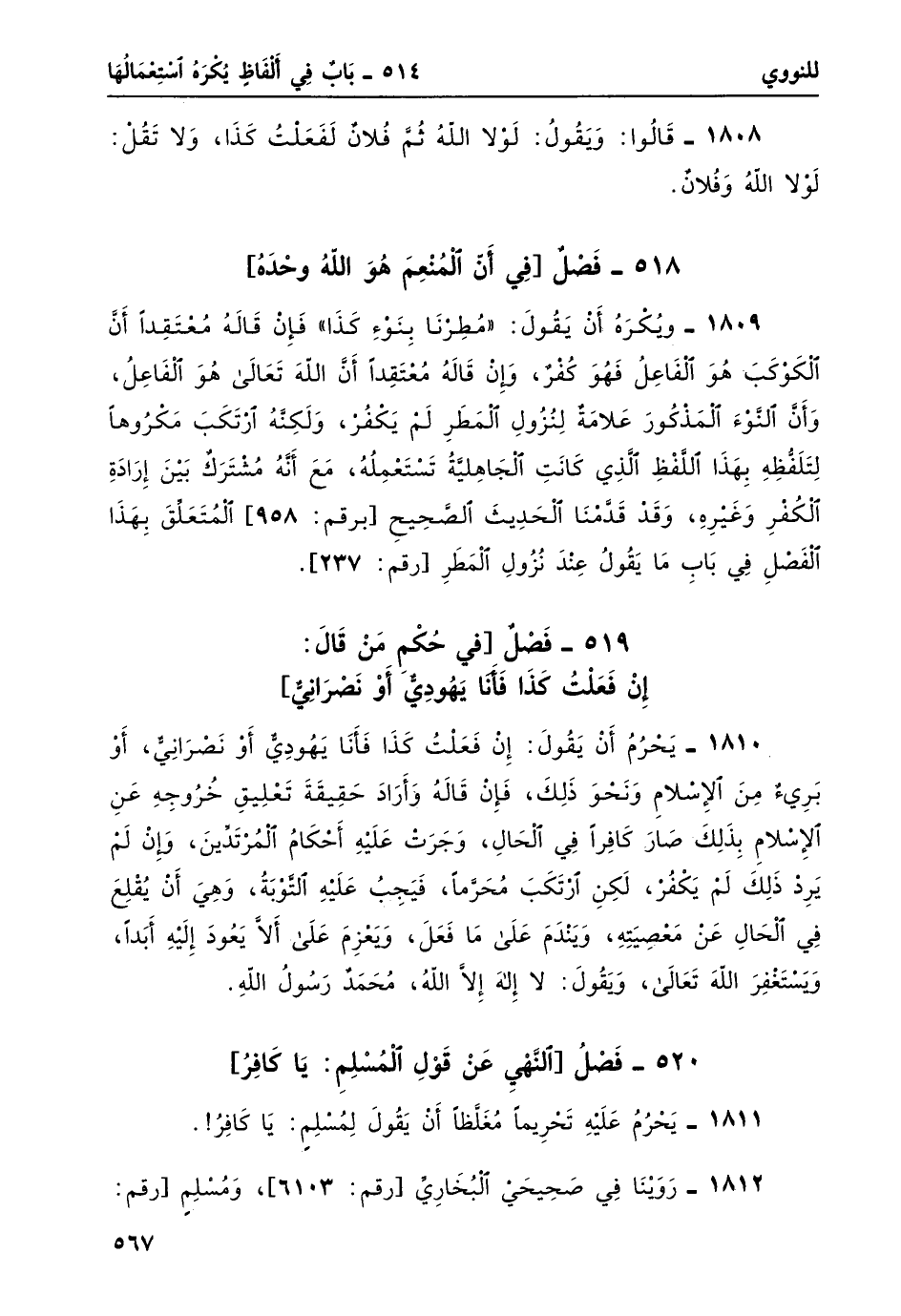 1809- ويُكره أن يقول: "مُطرنا بنوءِ كذا" فإن قالهُ معتقداً أن الكوكب هو الفاعلُ فهو كفرٌ، وإن قالهُ معتقداً أن الله تعالى هو الفاعل، وأن النوْءَ المذكور علامةٌ لنزول المطر لم يكفر، ولكنه ارتكب مكروهاً لتلفظه بهذا اللفظ الذي كانت الجاهلية تستعملُه، مع أنه مشتركٌ بين إرادة الكفر وغيره، وقد قدَّمنا الحديث الصحيح [برقم: 958] المتعلق بهذا الفصل في باب ما يقولُ عند نزول المطر [رقم: 237] .