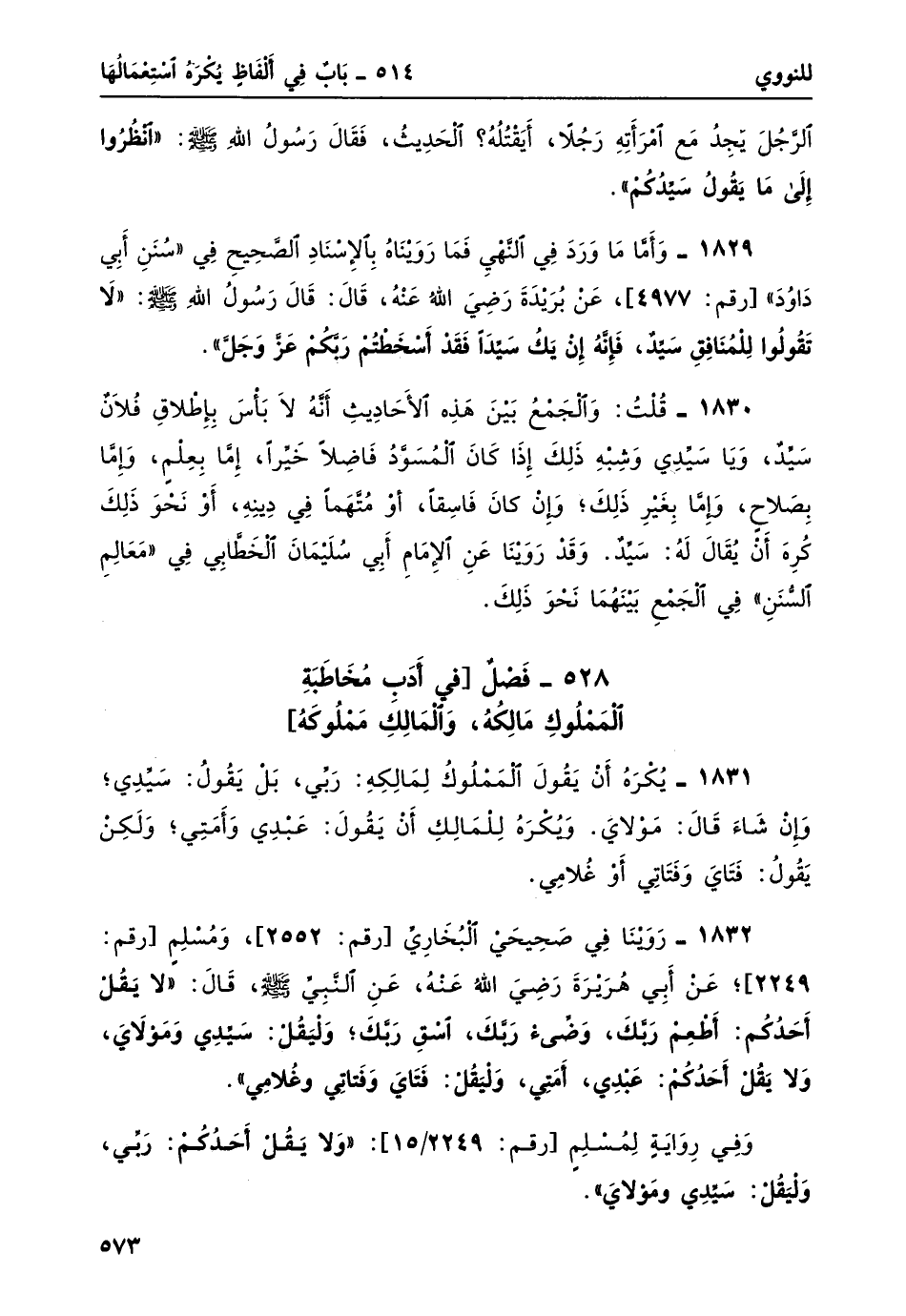 1830- قلتُ: والجمعُ بين هذه الأحاديث أنه لا بأس بإطلاق فلان سيد، ويا سيدي وشبه ذلك إذا كان المسودُ فاضلاً خَيِّرًا، إما بعلم، وإما بصلاح، وإما بغير ذلك؛ وإن كان فاسقاً، أو متهماً في دينه، أو نحو ذلك كره أن يُقال لهُ: سيدٌ. وقد رَوَيْنَا عن الإِمام أبي سليمانَ الخطابي في "معالم السنن" في الجمع بينهما نحو ذلك.