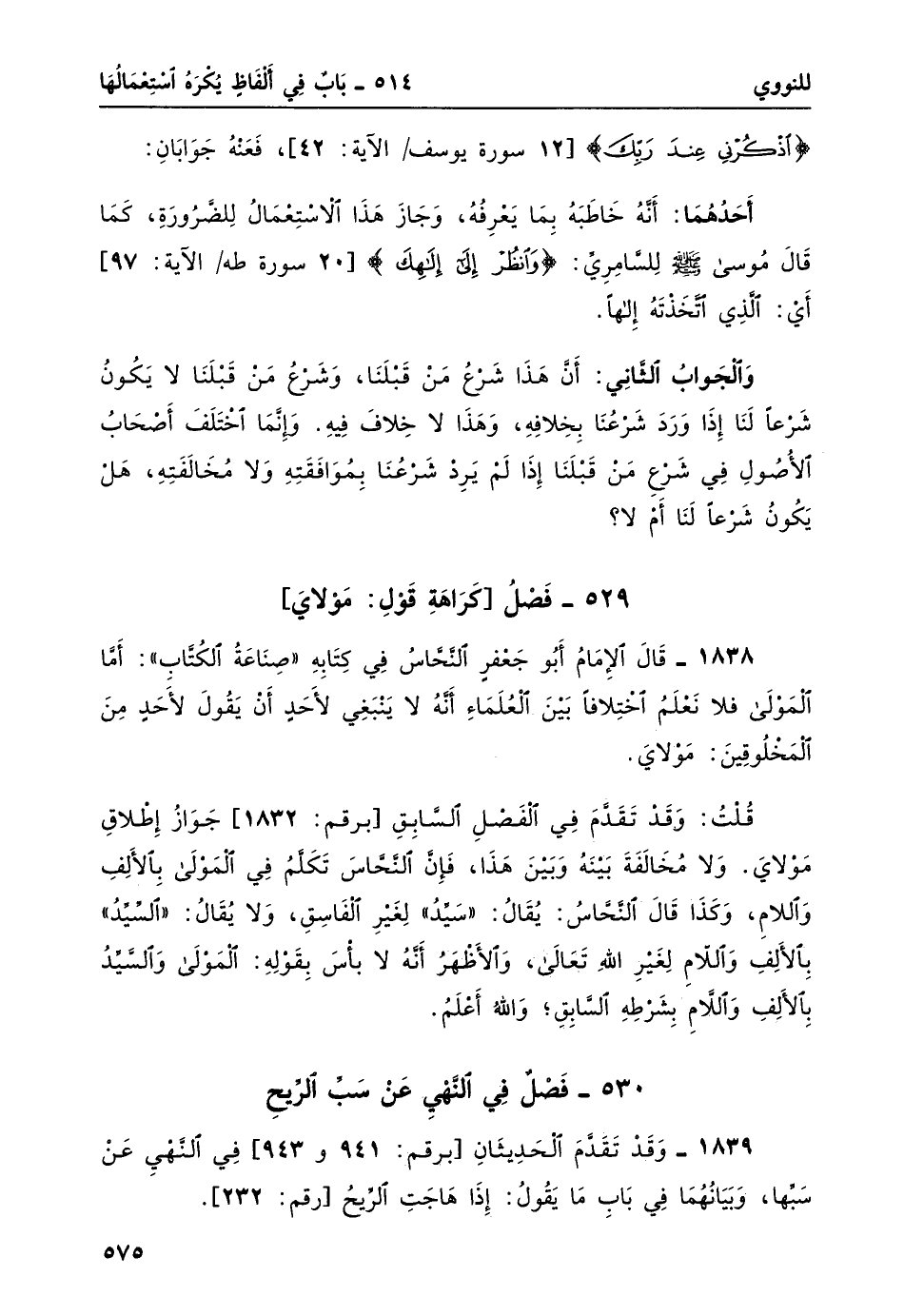 1838- قال الإمام أبو جعفرٍ النحاسُ في كتابهِ صناعة الكتاب: أما المولى فلا نعلمُ اختلافاً بين العلماءِ أنه لا ينبغي لأحدٍ أن يقول لأحدٍ من المخلوقين: مولاي.