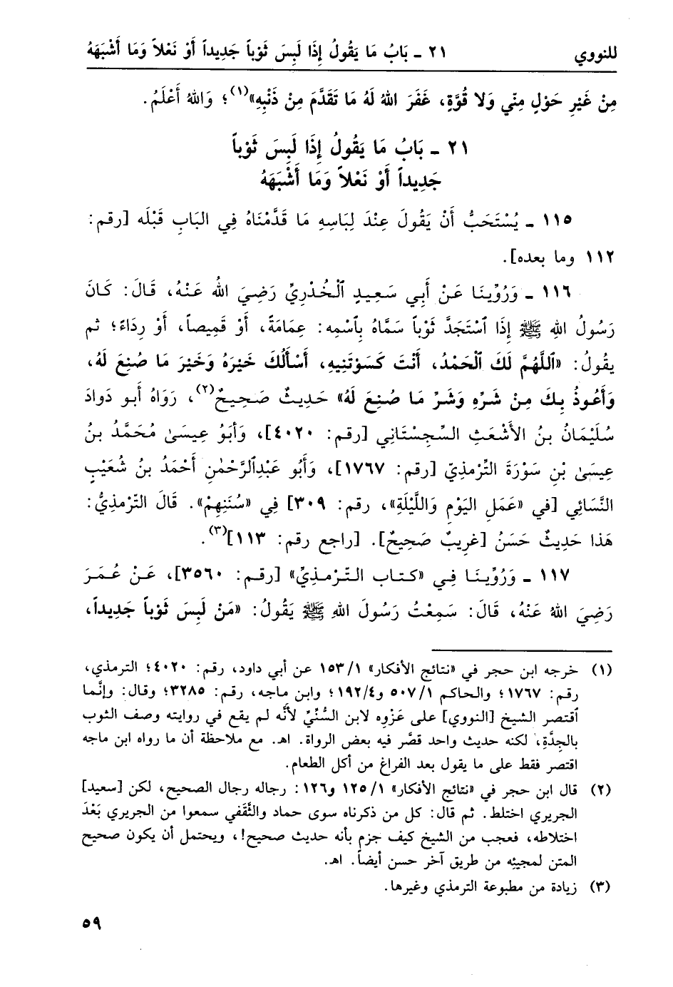 116- وروينا عن أبي سعيد الخدري رضي الله عنه، قال: كان رسول الله -صلى الله عليه وسلم- إذا استجدّ ثوباً سمَّاه باسمه: عمامة، أو قميصاً، أو رداء؛ ثم يقولُ: "اللَّهُمَّ لَكَ الحمدُ، أنْتَ كَسَوْتِنِيهِ، أسألُكَ خَيْرَهُ وَخَيْرَ ما صُنِعَ لَهُ، وأعُوذُ بِكَ مِنْ شَرِّهِ وَشَرِّ ما صُنِعَ لَهُ" حديث صحيح1، رواه أبو دواد سليمان بن الأشعث السجستاني [رقم: 4020] ، وأبو عيسى محمد بن عيسى بن سورة الترمذي [رقم: 1767] ، وأبو عبد الرحمن أحمد بن شعيب النسائي [في "عمل اليوم والليلة"، رقم: 309] في "سننهم". قال الترمذي: هذا حديث حسن [غريب صحيح] . [راجع رقم: 113] 2.