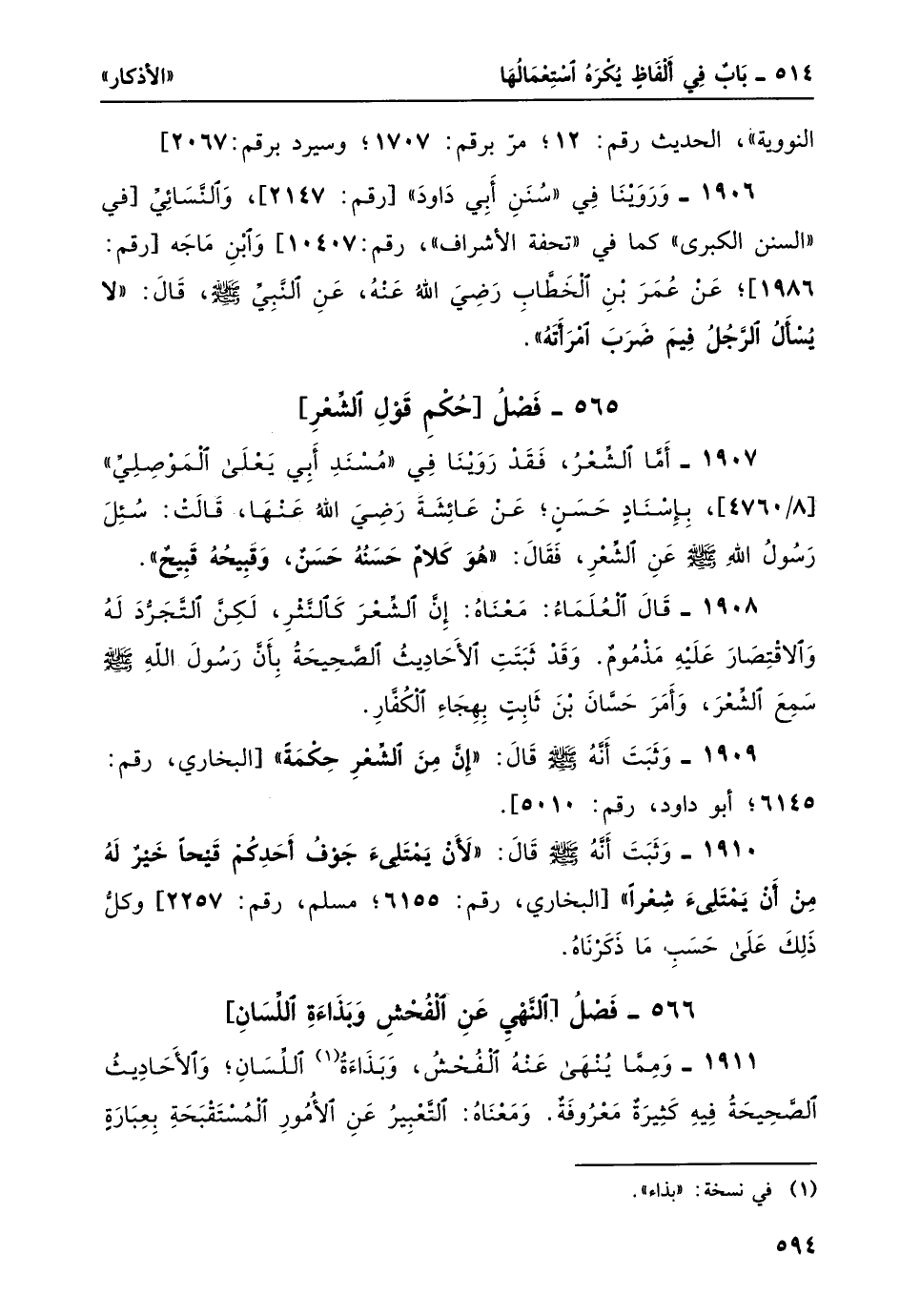 1910- وثبت أنه صلى الله عليه وسلم قال: "لأن يمتلئ جوفُ أحَدِكُمْ قَيْحاً خيرًا لَهُ منْ أنْ يمتلئ شعرًا" [البخاري، رقم: 6155؛ مسلم، رقم: 2257] وَكُلُّ ذلك على حسب ما ذكرناهُ.