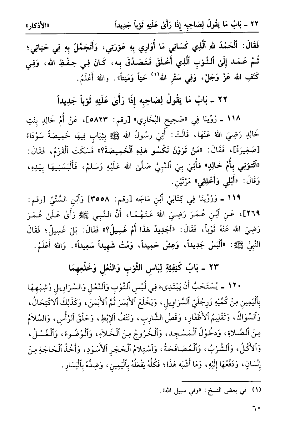 119- وروينا في كتابي ابن ماجه [رقم: 3558] وابن السني [رقم: 269] ، عن ابن عمر رضي الله عنهما، أن النبي -صلى الله عليه وسلم- رأى على عمر رضي الله عنه ثوباً، فقال: "أجَدِيدٌ هَذَا أمْ غَسِيلٌ"؟ فقال: بل غسيلٌ؛ فقال النبي -صلى الله عليه وسلم: "الْبَسْ جَدِيداً، وَعِشْ حَمِيداً، وَمُتْ شَهِيداً سعيدًا". والله أعلم.