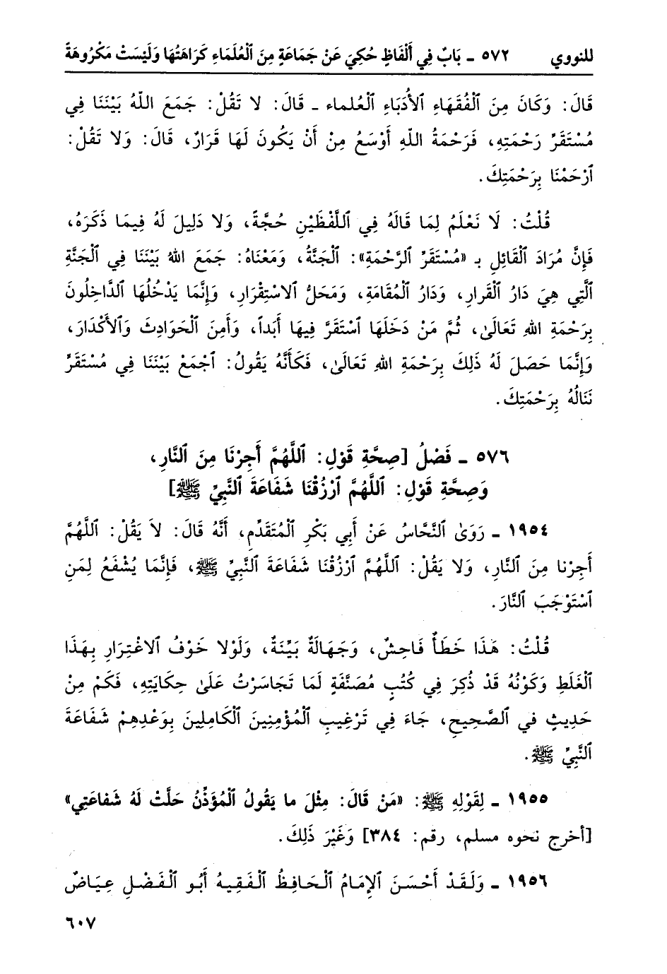 1953- ومن ذلك ما رواهُ النحاسُ، عن أبي بكرٍ محمدِ بن يحيى -قال: وكان من الفقهاء الأدباء العُلماء، قال: لا تقُل: جمعَ اللهُ بيننا في مستقرٌ رحمتهِ، فرحمةُ اللهِ أوسعُ من أن يكونَ لها قرارٌ، قال: ولا تقُل: ارحمنا برحمتك.