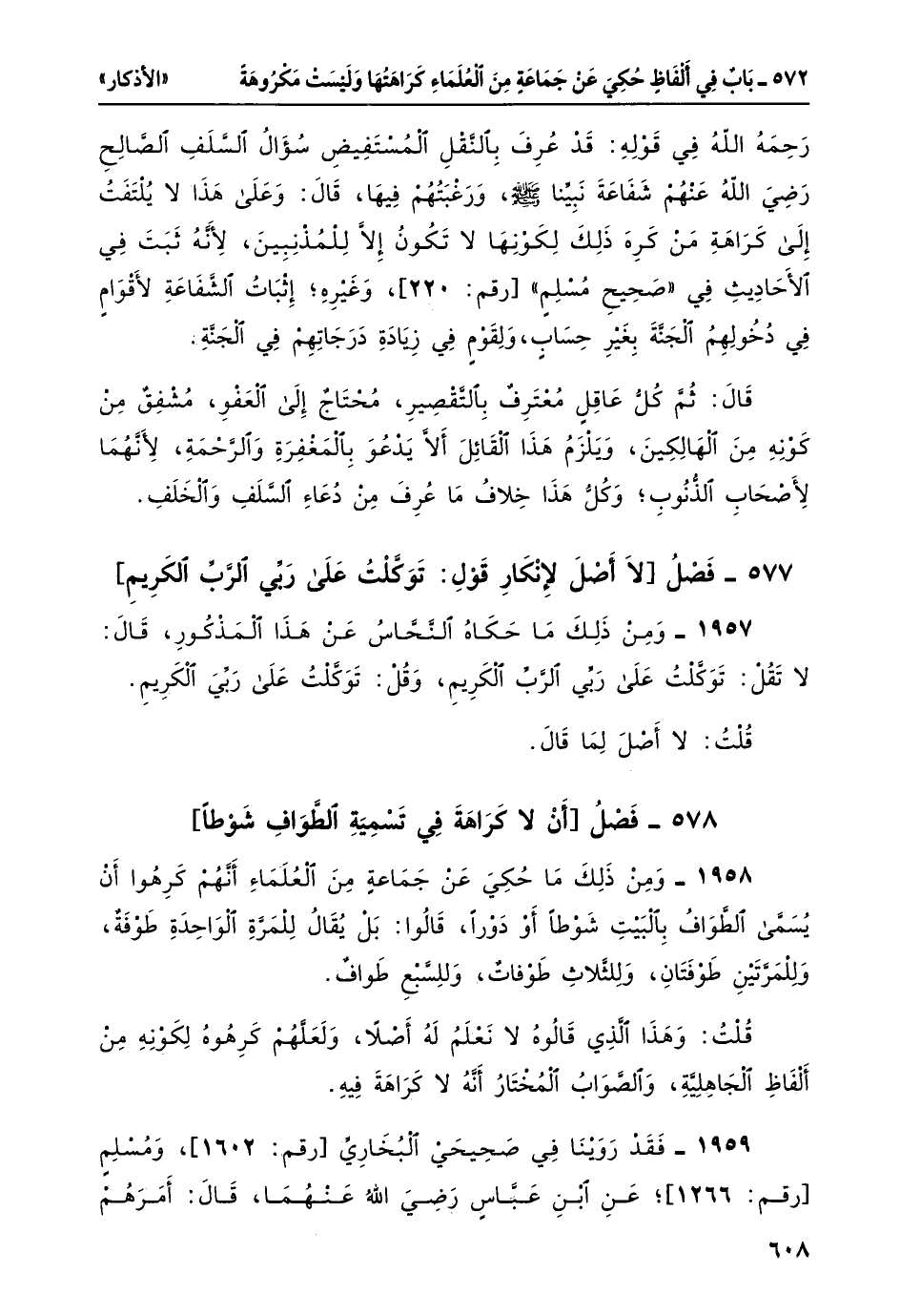 1957- ومن ذلك ما حكاهُ النحَّاسُ عن هذا المذكور، قال: لا تقُل: توكّلتُ على ربي الربّ الكريم، وقل: توكلتُ على ربي الكريم.