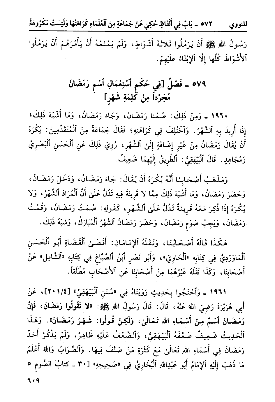 1961- واحتجُّوا بحديث رويناه في سنن البيهقي 201/4، عن أبي هريرة -رضي الله عنهُ، قال: قال رسول الله -صلى الله عليه وسلم: "لا تَقُولُوا رَمَضَانُ، فإنَّ رَمَضَانَ اسْمٌ مِنْ أسْماءِ اللَّهِ تَعالى، وَلَكِنْ قُولُوا: شَهْرُ رَمَضَانَ". وهذا الحديثُ ضعيفٌ ضعَّفهُ البيهقيُ، والضعف عليه ظاهرٌ، ولم يذكرْ أحدٌ رمضانَ في أسماء الله تعالى مع كثرةِ مَنْ صُنِّفَ فيها. والصوابُ والله أعلمُ: ما ذهب إليه الإِمام أبو عبد الله البخاري في صحيحه 30- كتاب الصوم 5