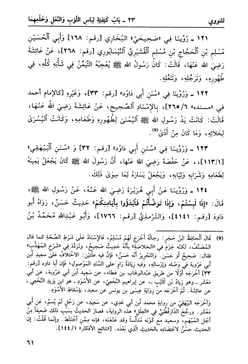 124- وروينا عن أبي هريرة رضي الله عنه، عن رسول الله -صلى الله عليه وسلم- قال: "إذَا لَبِسْتُمْ، وَإذَا توضأتم فابدءوا بأيامنكم" حديث حسن، رواه أبو داود [رقم: 4141] ، والترمذي [رقم: 1766] ، وأبو عبد الله محمد بن يزيد، هو ابن ماجه [رقم: 402] ، وأبو بكر أحمد بن الحسين البيهقي [86/1] .