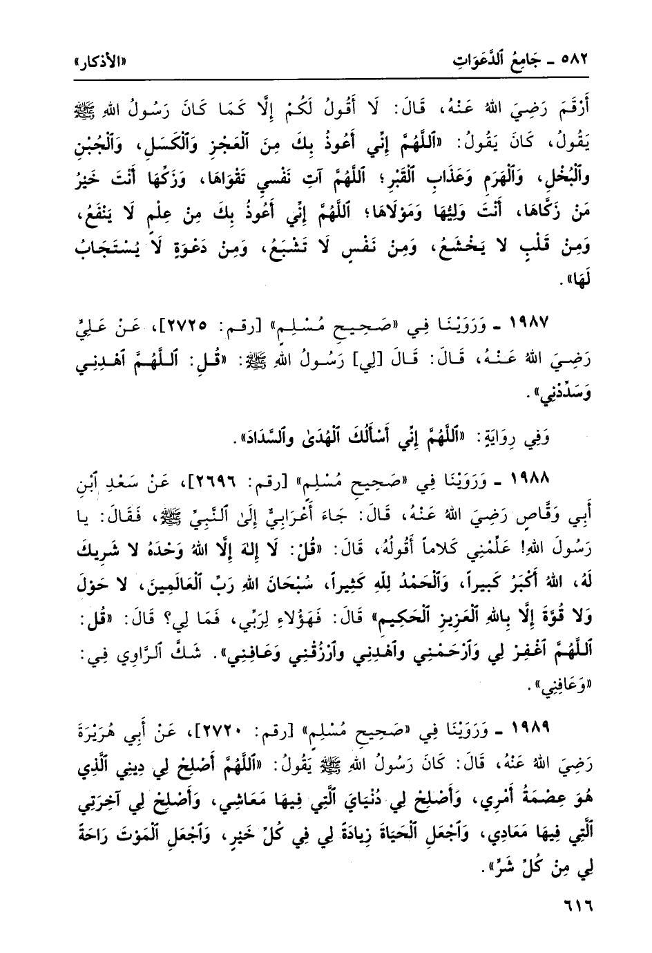 1989- وروينا في صحيح مسلم [رقم: 2720] ، عن أبي هريرة -رضي الله عنهُ، قال: كان رسول الله -صلى الله عليه وسلم- يقول: "اللَّهُمَّ أصْلِحْ لي دِينِي الَّذِي هُوَ عصمةُ أمْرِي، وأصْلِحْ لي دُنياي الَّتِي فيها مَعاشِي، وأصْلِحْ لي آخِرَتِي الَّتي فيها مَعادي، وَاجْعَلِ الحَياةَ زيادَةً لي في كُلّ خيرٍ، وَاجْعَلِ المَوْتَ راحَةً لي مِنْ كُلّ شَرٍّ".