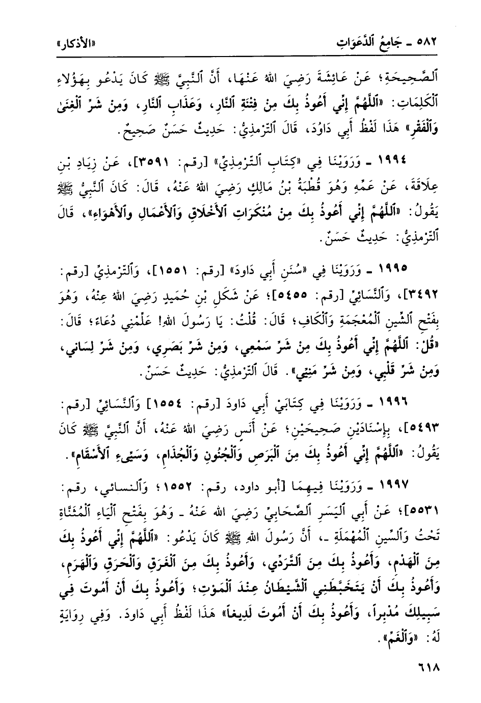 1996- وروينا في كتابي أبي داود [رقم: 1554] والنسائي [رقم: 5493] ، بإسنادين صحيحين؛ عن أنسٍ -رضي الله عنهُ، أن النبي -صلى الله عليه وسلم- كان يقولُ: "اللهم إني أعوذُ بِكَ مِنَ البَرَصِ والجنون والجذامِ، وسيئ الأسْقامِ".