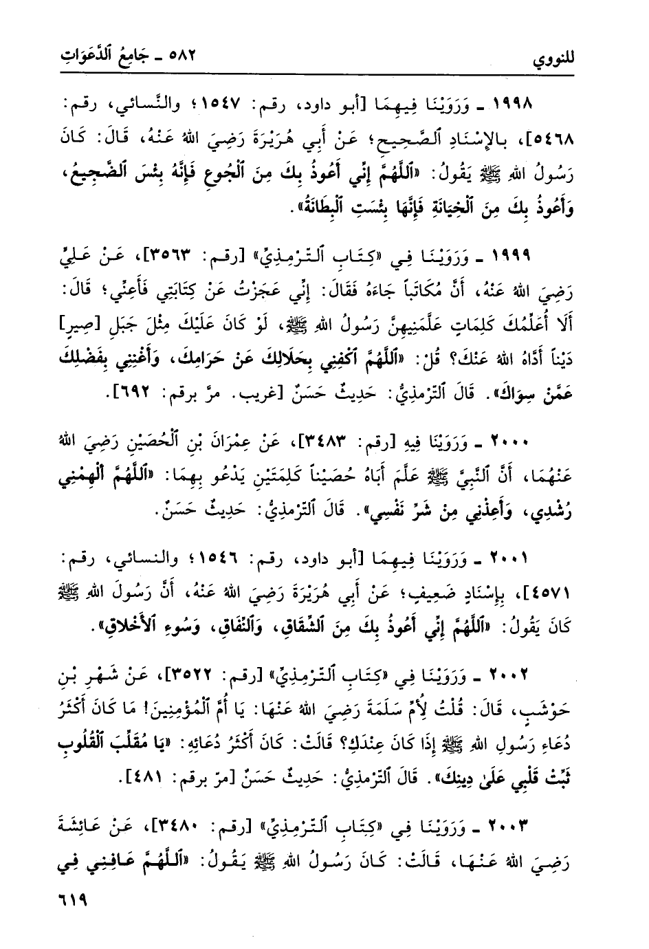 2000- وروينا فيه [رقم: 3483] ، عن عمران بن الحصين -رضي اللهُ عنهما، أن النبي -صلى الله عليه وسلم- علَّمَ أباهُ حصيناً كلمتين يدعو بهما: "اللَّهُمَّ ألْهِمْنِي رُشْدِي، وَأعِذْنِي مِنْ شَرّ نَفْسِي". قال الترمذي: حديثٌ حسنٌ.