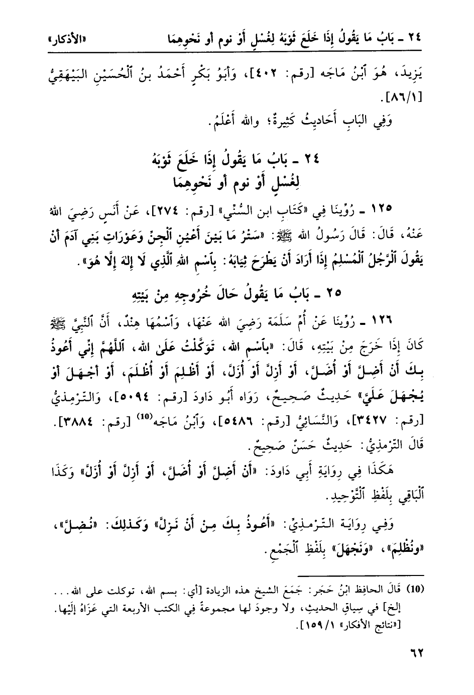 126- روينا عن أُمّ سلمة رضي الله عنها، واسمها هند، أن النبي -صلى الله عليه- وسلم كانَ إذَا خَرَجَ مِنْ بَيْتِهِ، قالَ: "باسْمِ اللَّهِ، تَوَكَّلْتُ على اللَّهِ، اللَّهُمَّ إنِّي أعُوذُ بِكَ أنْ أَضِل أَوْ أُضَل، أوْ أَزِل أَوْ أُزَل، أَوْ أَظلِم أَوْ أُظْلَم، أوْ أَجْهَل أَوْ يُجْهَلَ عليَّ" حديث صحيح، رواه أبو داود [رقم: 5094] ، والترمذي [رقم: 3427] ، والنسائي [رقم: 5486] ، وابن ماجه1 [رقم: 3884] . قال الترمذي: حديث حسن صحيح.