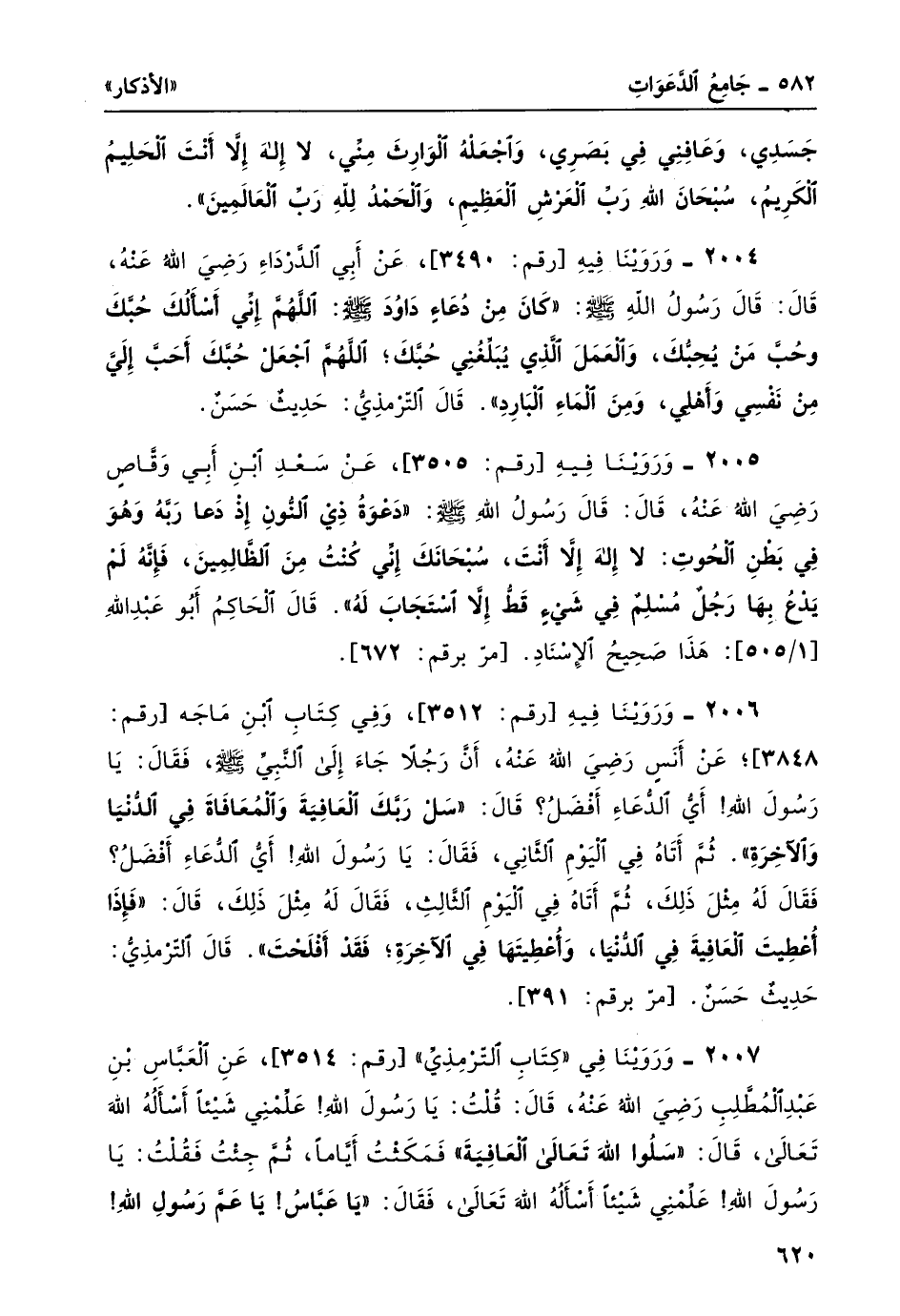 2007- وروينا في كتاب الترمذي [رقم: 3514] ، عن العباس بن عبد المطلب -رضي الله عنه- قال: قلتُ: يا رسول الله! علمني شيئا أسألهُ الله تعالى، قال: "سَلُوا اللهَ تعالى العافِيَةَ" فمكثتُ أياماً، ثم جئتُ فقلتُ: يا رسولَ الله! علمني شيئا أسأله الله تعالى، فقال: "يا عَبَّاسُ! يا عمَّ رَسُول اللَّهِ!