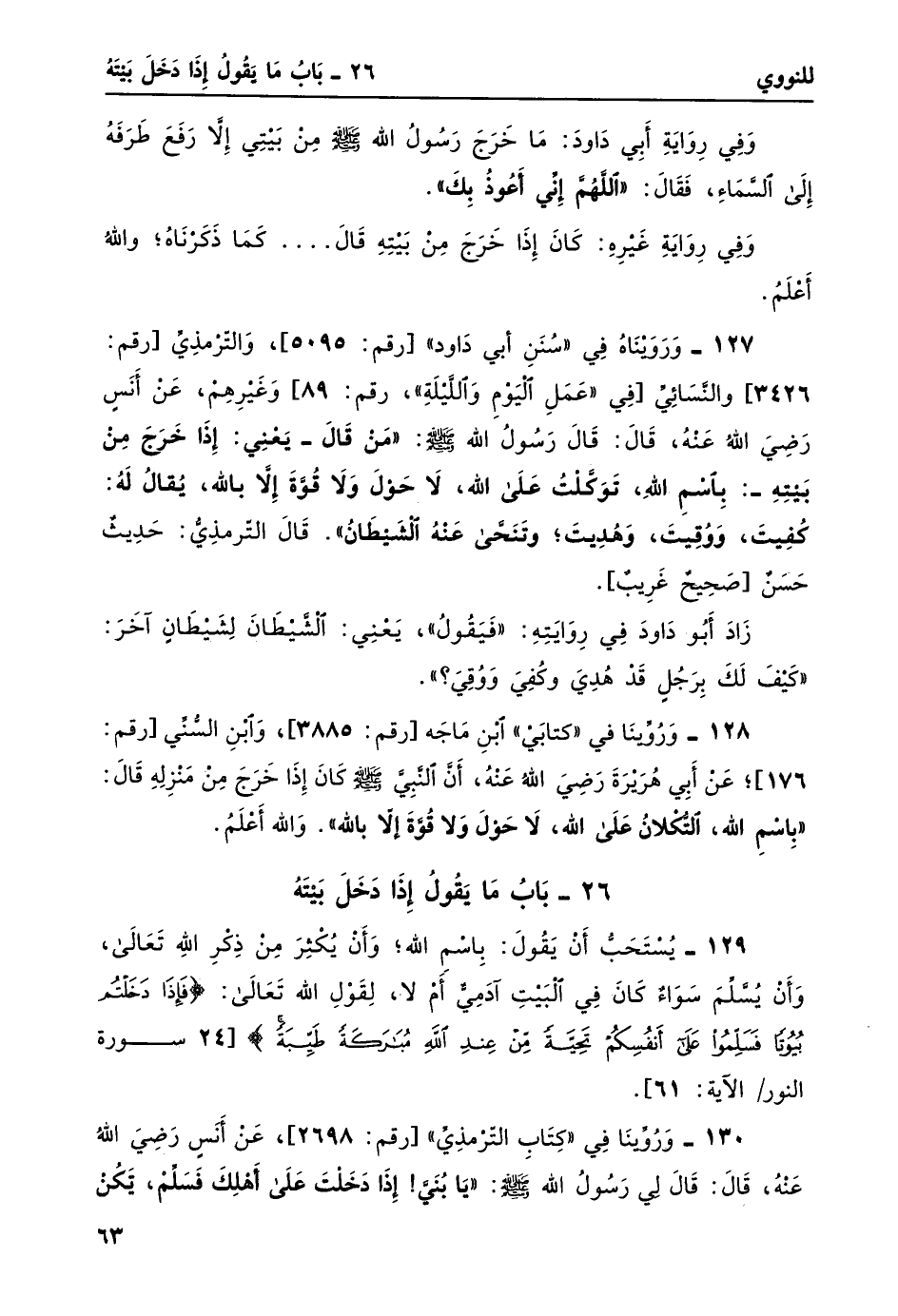 128- وروينا في "كتابي" ابن ماجه [رقم: 3885] ، وابن السني [رقم: 176] ؛ عن أبي هريرة رضي الله عنهُ، أن النبي -صلى الله عليه وسلم- كانَ إذَا خَرَجَ من منزله قال: "باسم الله، التُّكْلانُ على الله، لا حَوْلَ وَلا قُوَّةَ إِلاَّ باللَّهِ". والله أعلم.