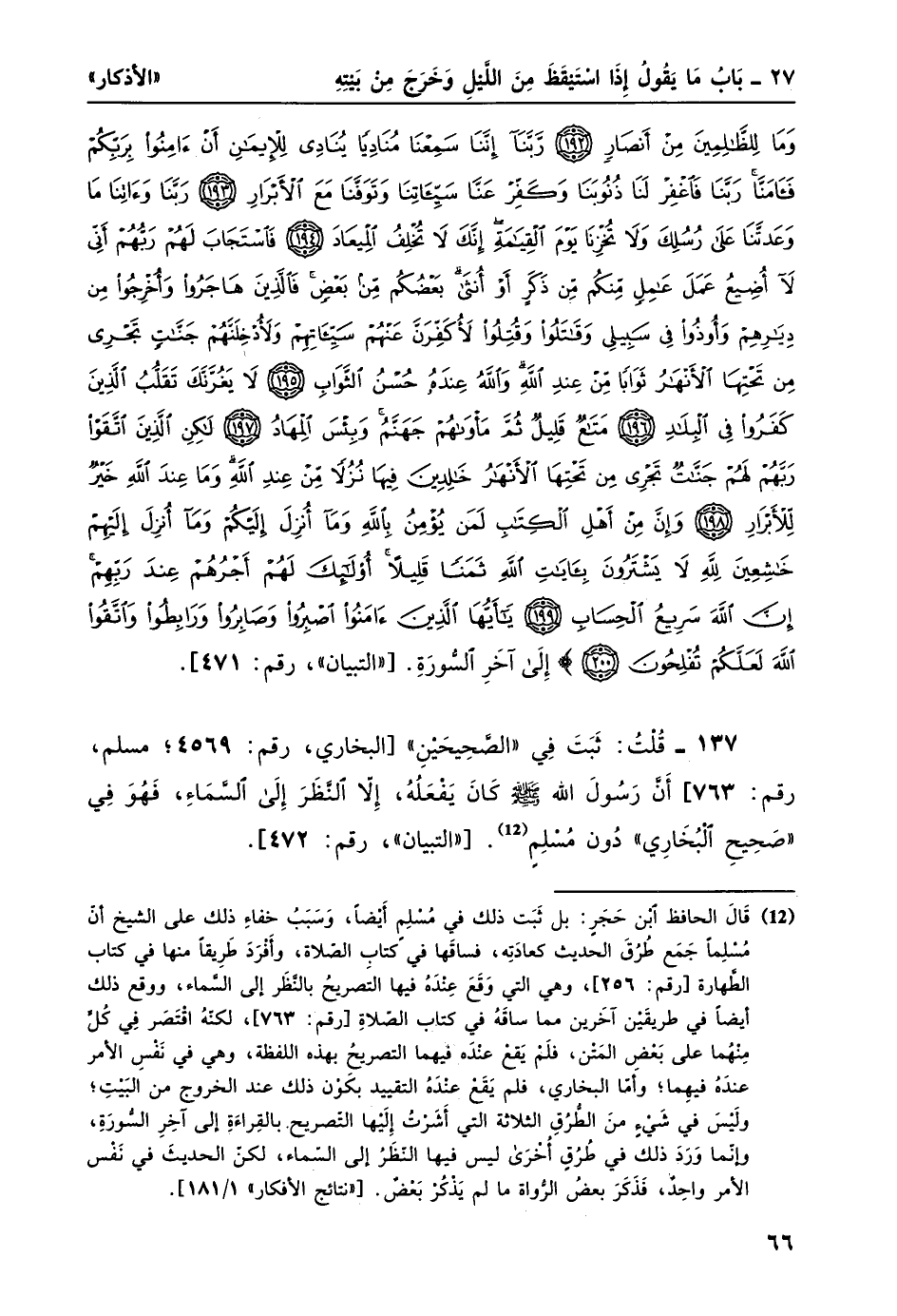 1 قال الحافظ ابن حجر: بل ثبت ذلك في مسلم أيضًا، وسبب خفاء ذلك على الشيخ أن مسلمًا جمع طرق الحديث كعادته، فساقها في كتاب الصلاة، وأفرد طريقًا منها في كتاب الطهارة [رقم: 256] ، وهي التي وقع عنده فيها التصريح بالنظر إلى السماء، ووقع ذلك أيضًا في طريقين آخرين مما ساقهُ في كتاب الصلاة [رقم: 763] ، لكنه اقتصر في كل منهما على بعض المتن، فلم يقع عنده فيهما التصريح بهذه اللفظة، وهي في نفس الأمر عنده فيهما؛ وأما البخاري، فلم يقع عنده التقييد بكون ذلك عند الخروج من البيت؛ وليس في شيء من الطرق الثلاثة التي أشرت إليها التصريح بالقراءة إلى آخر السورة، وإنما ورد ذلك في طرق أخرى ليس فيها النظر إلى السماء، لكن الحديث في نفس الأمر واحد، فذكر بعض الرواة ما لم يذكر بعض. ["نتائج الأفكار" 1 /181.