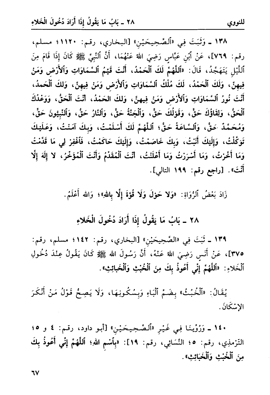 140- وروينا في غير "الصحيحين" [أبو داود، رقم: 4 و 5؛ الترمذي، رقم: 5؛ النسائي، رقم: 19] : "باسْمِ اللَّهِ؛ اللَّهُمَّ إني أعُوذُ بِكَ مِنَ الخُبْثِ وَالخبائِثِ".