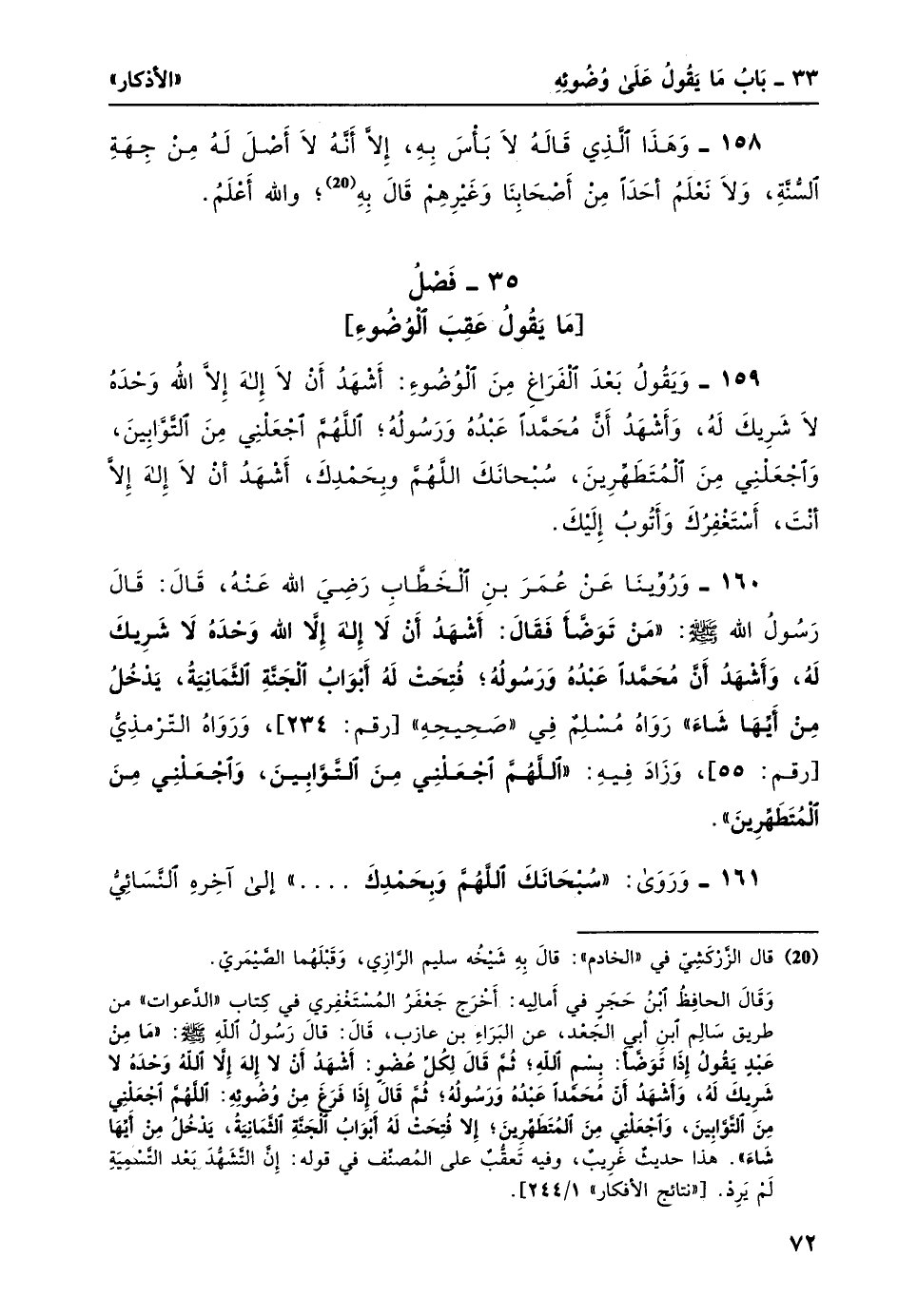 159- ويقول بعد الفراغ من الوضوء: أشْهَدُ أنْ لا إِلهَ إِلاَّ اللَّه وحدهُ لا شريكَ له، وأشهدُ أنَّ محمدا عَبْدُهُ وَرَسُولُهُ؛ اللَّهُمَّ اجْعَلْنِي مِنَ التَوَّابِينَ، واجْعَلْني مِنَ المُتَطَهِّرِينَ، سُبْحانَكَ اللَّهُمَّ وبِحَمْدِكَ، أشْهَدُ أنْ لا إِلهَ إِلاَّ أنْتَ، أسْتَغْفِرُكَ وأتُوبُ إِلَيْكَ.