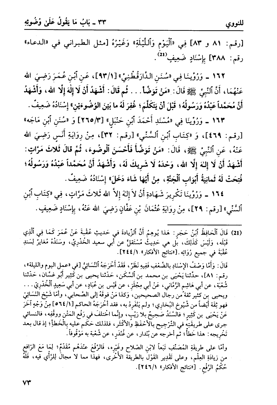 162- وروينا في "سنن الدارقطني" [93/1] ، عن ابن عمر رضي الله عنهما، أن النبي -صلى الله عليه وسلم- قال: "مَنْ تَوَضَّأ.. ثُم قال: أشْهَدُ أنْ لا إِلهَ إِلاَّ اللَّه، وأشهد أنَّ مُحَمَّداً عَبْدُهُ وَرَسُولُهُ؛ قَبْلَ أنْ يَتَكَلَّم؛ غُفِرَ لَهُ ما بَيْنَ الوُضُوءَيْن" إسناده ضعيف.