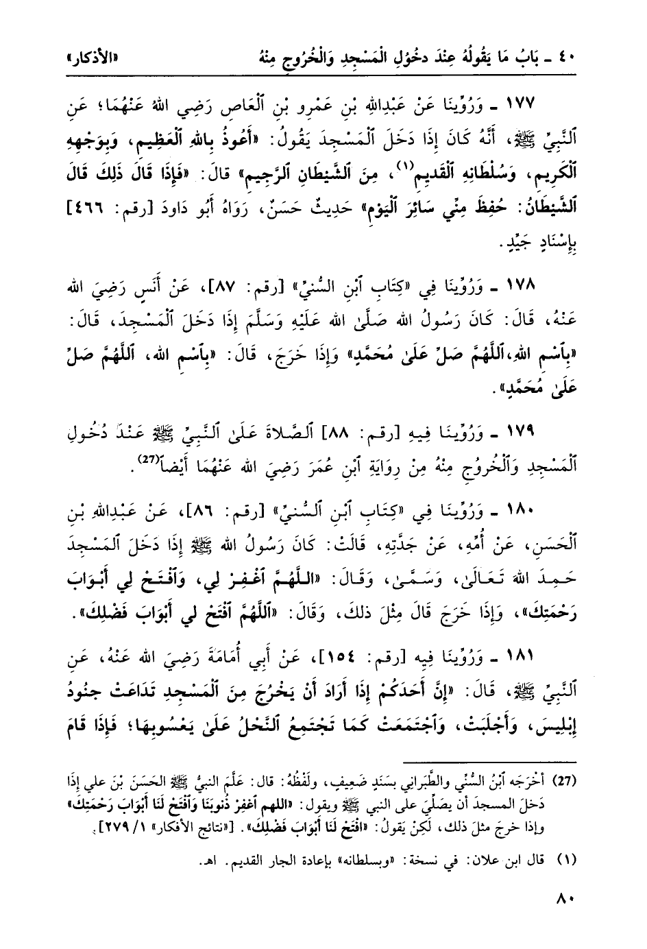 177- وَرُوِّينا عن عبد الله بن عمرو بن العاص رضي الله عنهما؛ عن النبيّ -صلى الله عليه وسلم- أنه كان إذا دخل المسجد يقول: "أعُوذُ بالله العظيم، وبوجهه الكريم، وسلطانه القديم 1، من الشيطان الرجيم" قال: "فإذَا قَال ذلكَ قالَ الشيطانُ: حُفِظَ مِنِّي سائِرَ اليَوْمِ" حديث حسن، رواه أبو داود [رقم: 466] بإسناد جيد.