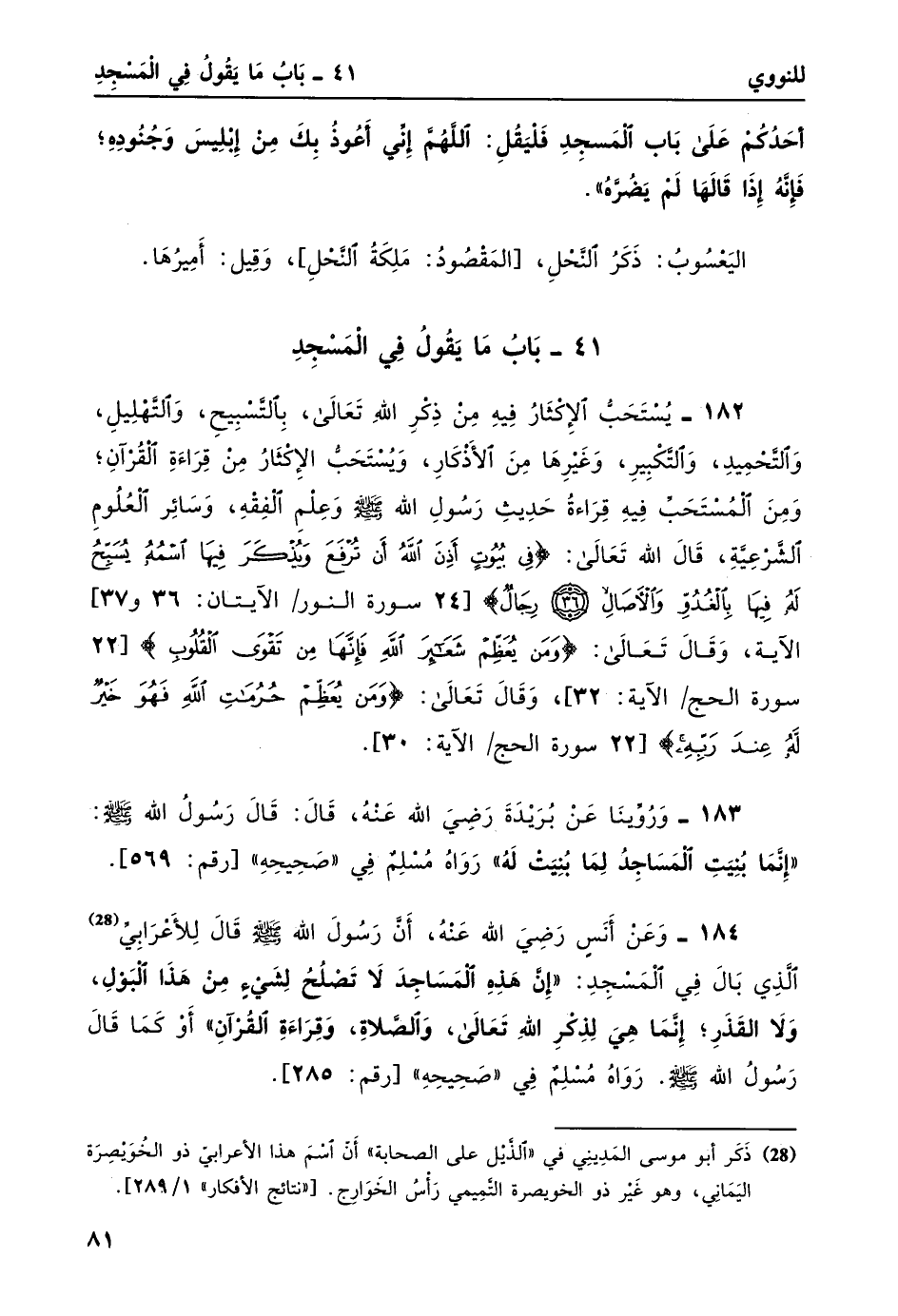 184- وعن أنس رضي الله عنه، أن رسول الله -صلى الله عليه وسلم- قال للأعرابيّ1 الذي بال في المسجد: "إنَّ هَذِه المَساجدَ لا تَصْلُحُ لشيءٍ مِنْ هَذَا البَولِ، وَلا القَذَرِ؛ إنَّمَا هِيَ لِذِكْرِ اللَّهِ تعالى؛ والصلاة، وَقَرَاءَةِ القُرآنِ" أو كما قال رسول الله -صلى الله عليه وسلم. رواه مسلم في "صحيحه" [رقم: 285] .