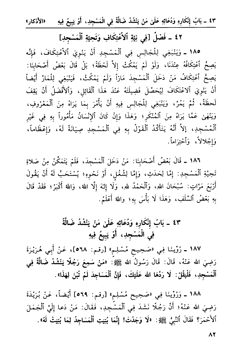185- وينبغي للجالس في المسجد أن ينوي الاعتكاف، فإنه يصحّ اعتكافه عندنان ولو لم يمكث إلا لحظة؛ بل قال بعض أصحابنا: يصحّ اعتكاف من دخل المسجد مارّاً ولم يمكث، فينبغي للمارّ أيضاً أن ينوي الاعتكاف ليُحَصِّلَ فضيلتَه عند هذا القائل، والأفضل أن يقف لحظة، ثم يمرّ، وينبغي للجالس فيه أن يأمر بما يراه من المعروف، وينهي عمّا يراه من المنكر؛ وهذا وإن كان الإِنسان مأموراً به في غير المسجد، إلا أنه يتأكد القولُ به في المسجد صيانةً له وإعظاماً، وإجلالاً، واحتراماً.