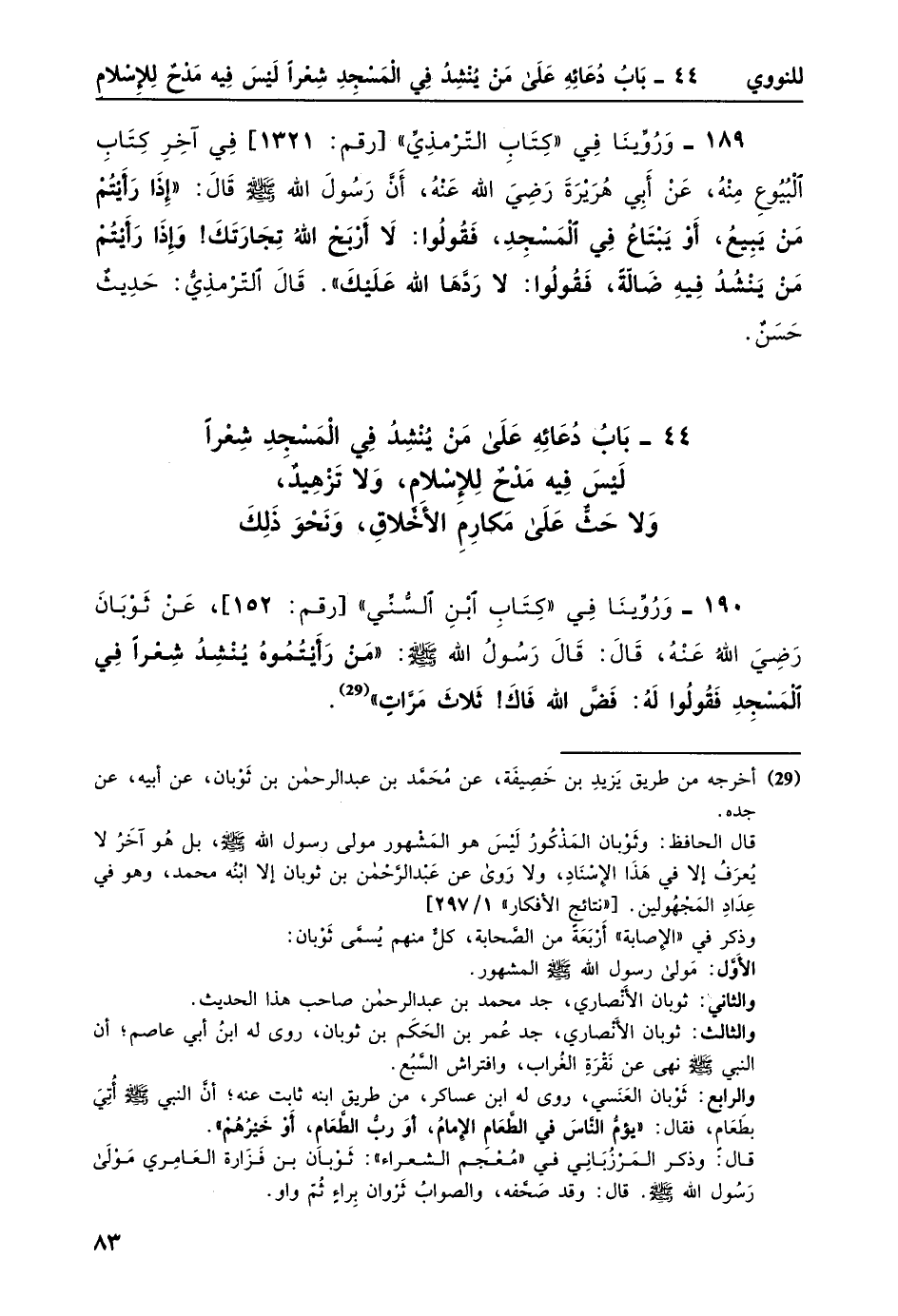 190- وروينا في "كتاب ابن السني" [رقم: 152] ، عن ثوبان رضي الله عنه، قال: قال رسول الله -صلى الله عليه وسلم: "مَنْ رأيْتُمُوهُ يُنْشِدُ شِعْراً في المَسْجِدِ فَقُولُوا لَهُ: فَضَّ الله فَاكَ! ثلاث مرات" 1.