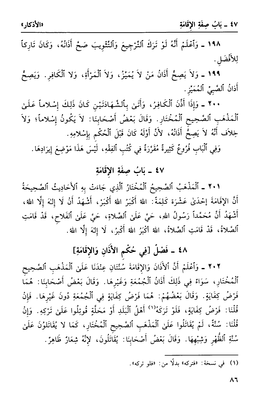 198- واعلم أنَّه لو تَرَكَ الترجيعَ والتثويبَ صحّ أذانهُ، وكان تاركاً للأفضل.