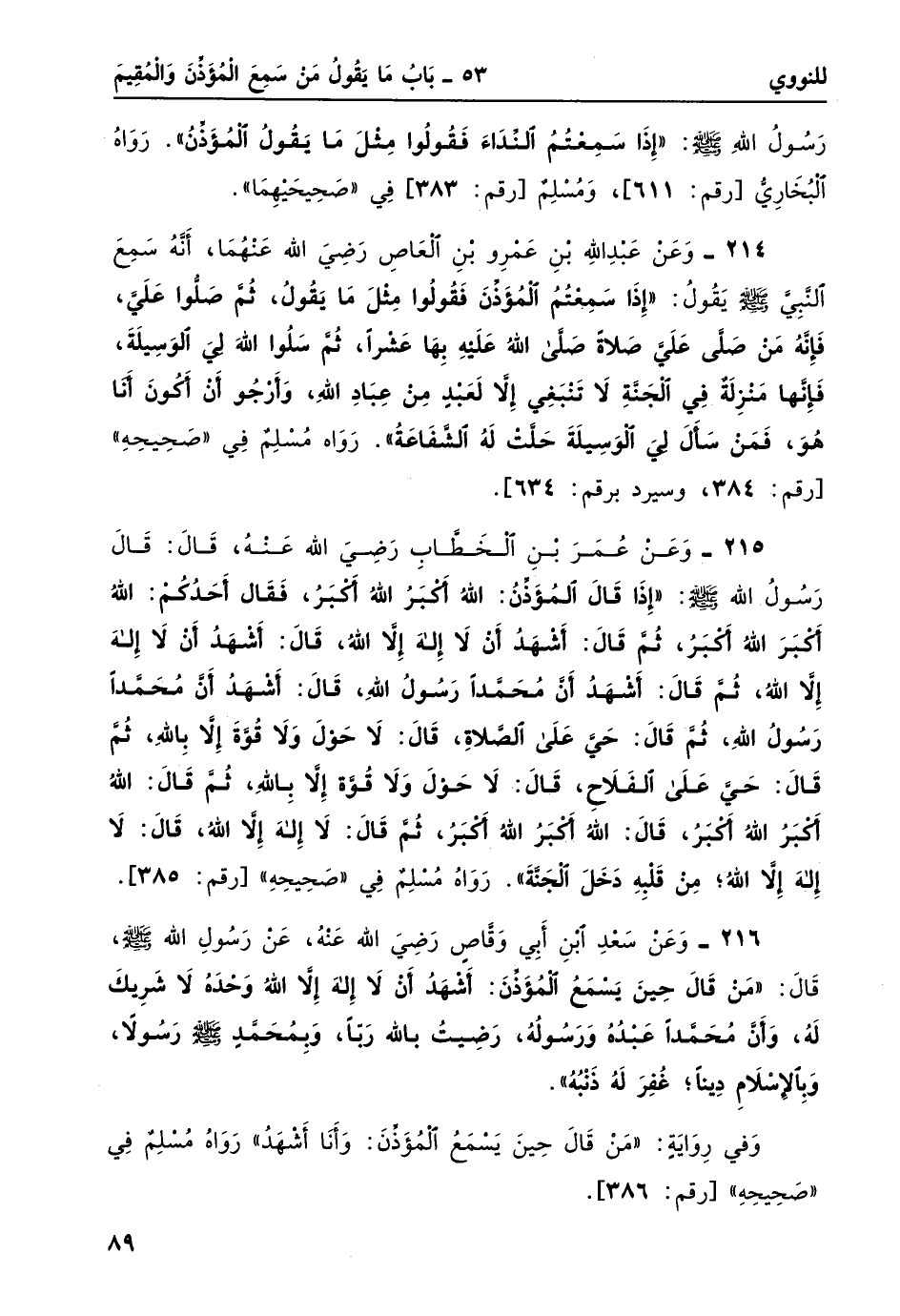 216- وعن سعد ابن أبي وقاص رضي الله عنه، عن رسول الله -صلى الله عليه وسلم- قال: "مَن قَالَ حِينَ يَسْمَعُ المُؤَذّنَ: أشهدُ أنْ لا إِلهَ إِلاَّ اللَّه وحده لا شريك له، وأن محمدا عَبْدُهُ وَرَسُولُهُ، رَضِيتُ باللَّهِ رَبّاً، وبمحمدٍ صلى الله عليه وسلم رسولا، وبالإسلام دِيناً؛ غُفِرَ لَهُ ذَنْبُهُ".