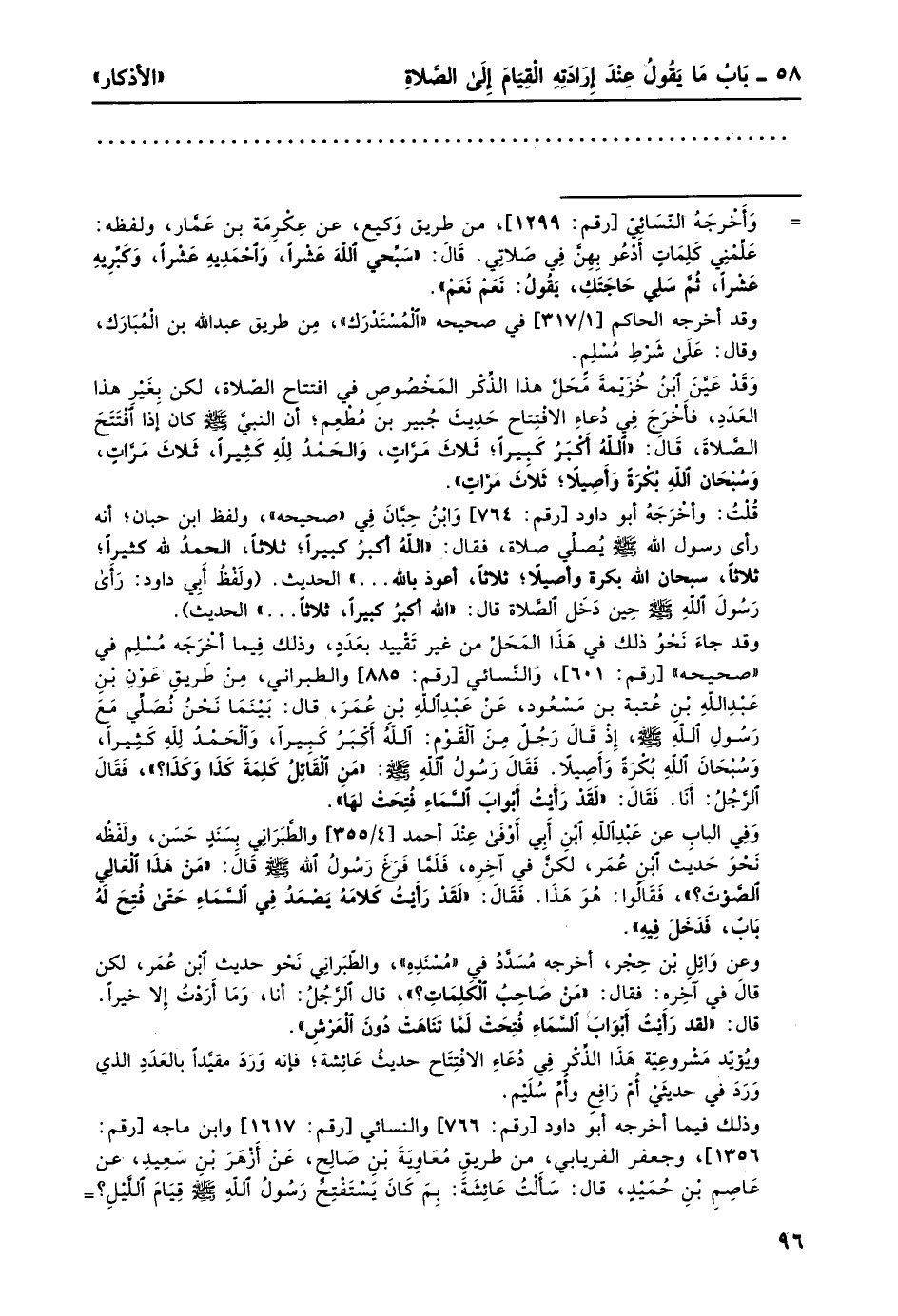 وقد جاء نحو ذلك في هذا المحل من غير تقييد بعدد، وذلك فيماأخرجه مسلم في "صحيحه" [رقم: 601] ، والنسائي [رقم: 885] والطبراني، من طريق عون بن عبد الله بن عتبة بن مسعود، عن عبد الله بن عمر، قال: بينما نحن نصلي مع رسول الله صلى الله عليه وسلم، إذ قال رجل من القوم: الله أكبر كبيرًا، والحمد لله كثيرًا، وسبحان الله بكرة وأصيلاً. فقال رسول الله صلى الله عليه وسلم: "من القائل كلمة كذا وكذا"؟، فقال الرجل: أنا. فقال: "لقد رأيت أبواب السماء فتحت لها".