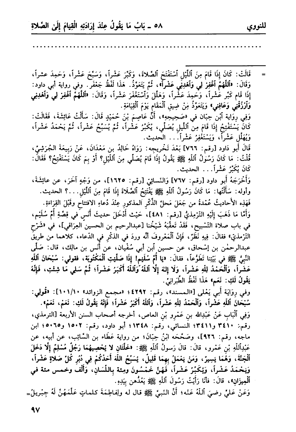 = قالت: كان إذا قام من الليل استفتح الصلاة، وكبر عشرًا، وسبح عشرًا، وحمد عشرًا، وقال: "اللهم اغفر لي واهدني" عشرًا، ثم يتعوذ. هذا لفظ جعفر. وفي رواية أبي داود: إذا قام كبر عشرًا، وحمد عشرًا، وهلل واستغفر عشرًا، وقال: "اللهم اغفر لي واهدني وارزقني وعافني" ويتعوذ من ضيق المقام يوم القيامة.