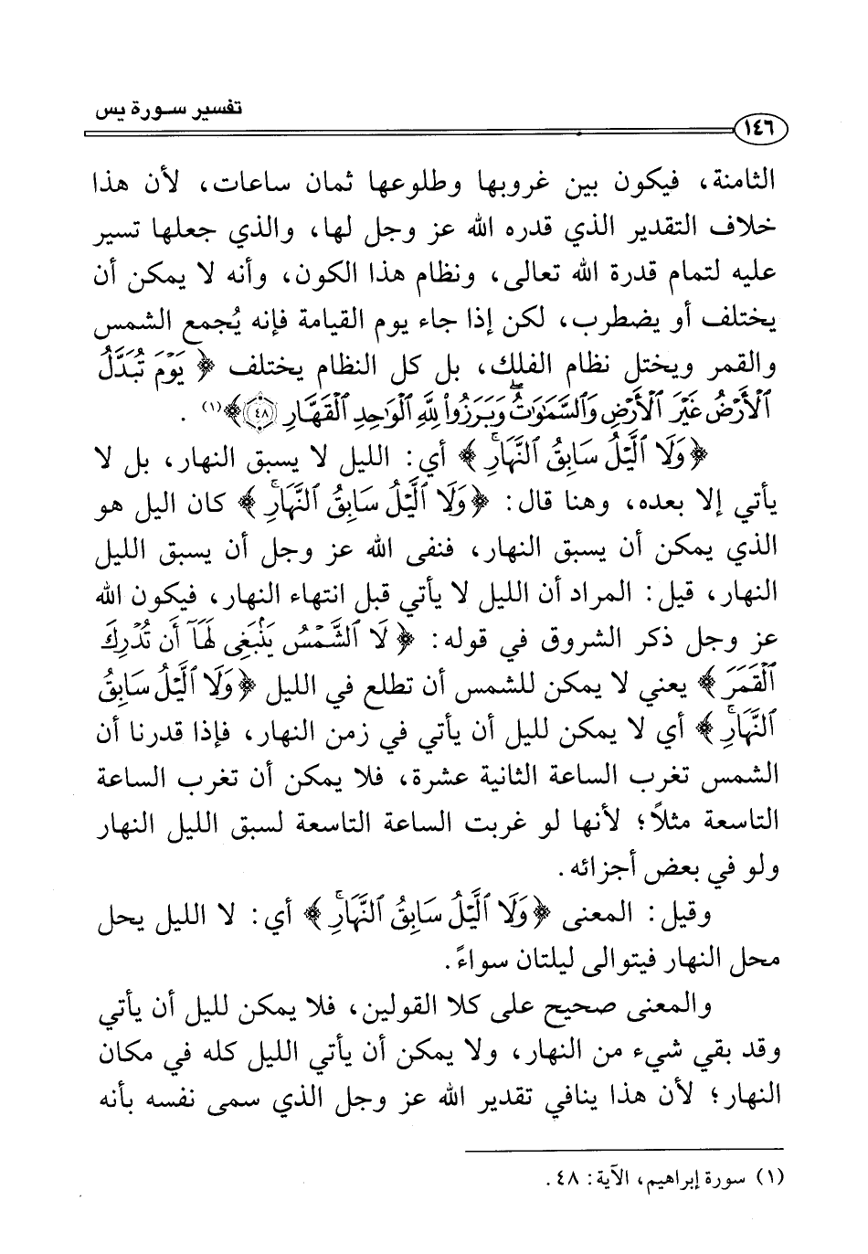 {وَلَا اللَّيْلُ سَابِقُ النَّهَارِ} أي: الليل لا يسبق النهار، بل لا يأتي إلَّا بعده، وهنا قال: {وَلَا اللَّيْلُ سَابِقُ النَّهَارِ} كان اليل هو الذي يمكن أن يسبق النهار، فنفى الله عَزَّ وَجَلَّ أن يسبق الليل النهار، قيل: المراد أن الليل لا يأتي قبل انتهاء النهار، فيكون الله عَزَّ وَجَلَّ ذكر الشروق في قوله: {لَا الشَّمْسُ يَنْبَغِي لَهَا أَنْ تُدْرِكَ الْقَمَرَ} يعني لا يمكن للشمس أن تطلع في الليل {وَلَا اللَّيْلُ سَابِقُ النَّهَارِ} أي لا يمكن لليل أن يأتي في زمن النهار، فإذا قدرنا أن الشمس تغرب الساعة الثانية عشرة، فلا يمكن أن تغرب الساعة التاسعة مثلًا؛ لأنها لو غربت الساعة التاسعة لسبق الليل النهار ولو في بعض أجزائه.