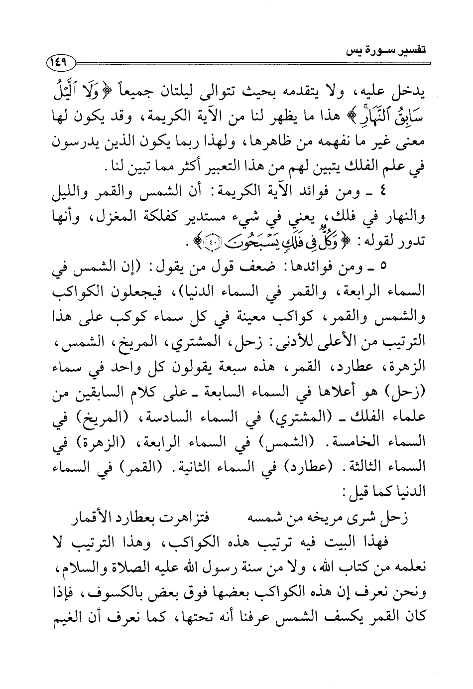 فهذا البيت فيه ترتيب هذه الكواكب، وهذا الترتيب لا نعلمه من كتاب الله، ولا من سنة رسول الله عليه الصلاة والسلام، ونحن نعرف إن هذه الكواكب بعضها فوق بعض بالكسوف، فإذا كان القمر يكسف الشمس عرفنا أنَّه تحتها، كما نعرف أن الغيم