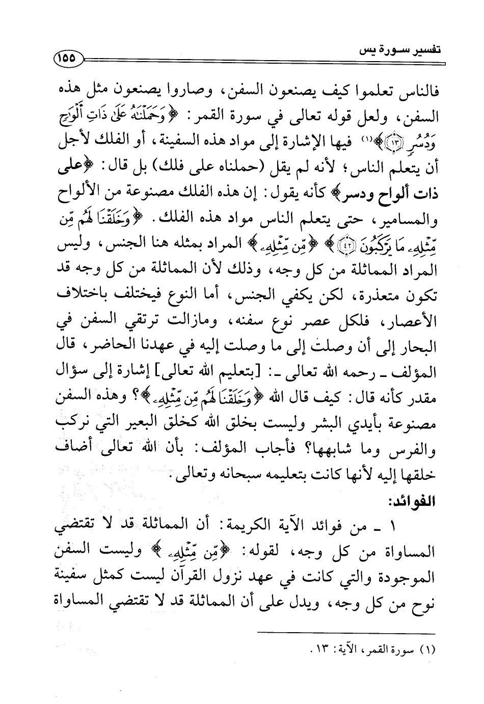 فالناس تعلموا كيف يصنعون السفن، وصاروا يصنعون مثل هذه السفن، ولعل قوله تعالى في سورة القمر: {وَحَمَلْنَاهُ عَلَى ذَاتِ أَلْوَاحٍ وَدُسُرٍ (١٣)} (¬١) فيها الإشارة إلى مواد هذه السفينة، أو الفلك لأجل أن يتعلم الناس، لأنه لم يقل (حملناه على فلك) بل قال: {عَلَى ذَاتِ أَلْوَاحٍ وَدُسُرٍ} كأنه يقول: إن هذه الفلك مصنوعة من الألواح والمسامير، حتى يتعلم الناس مواد هذه الفلك. {وَخَلَقْنَا لَهُمْ مِنْ مِثْلِهِ مَا يَرْكَبُونَ (٤٢)} {مِنْ مِثْلِهِ} المراد بمثله هنا الجنس، وليس المراد المماثلة من كل وجه، وذلك لأن المماثلة من كل وجه قد تكون متعذرة، لكن يكفي الجنس، أما النوع فيختلف باختلاف الأعصار، فلكل عصر نوع سفنه، وما زالت ترتقي السفن في البحار إلى أن وصلت إلى ما وصلت إليه في عهدنا الحاضر، قال المؤلف -رحمه الله تعالى-: [بتعليم الله تعالى] إشارة إلى سؤال مقدر كأنه قال: كيف قال الله {وَخَلَقْنَا لَهُمْ مِنْ مِثْلِهِ}؟ وهذه السفن مصنوعة بأيدي البشر وليست بخلق الله كخلق البعير التي نركب والفرس وما شابهها؟ فأجاب المؤلف: بأن الله تعالى أضاف خلقها إليه لأنها كانت بتعليمه سبحانه وتعالى.