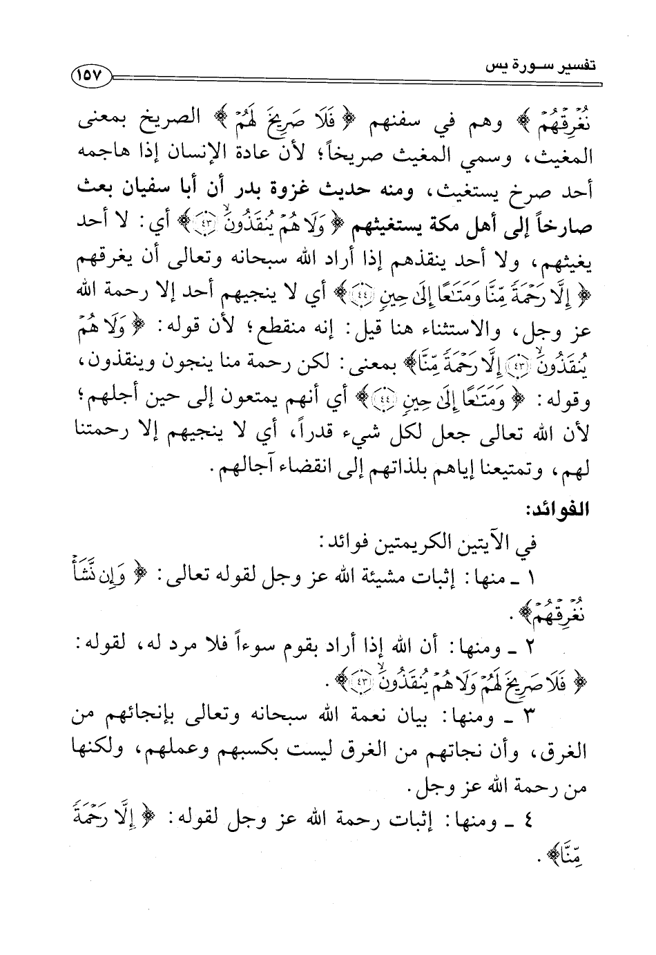 نُغْرِقْهُمْ} وهم في سفنهم {فَلَا صَرِيخَ لَهُمْ} الصريخ بمعنى المغيث، وسمي المغيث صريخًا؛ لأن عادة الإنسان إذا هاجمه أحد صرخ يستغيث، ومنه حديث غزوة بدر أن أبا سفيان بعث صارخًا إلى أهل مكة يستغيثهم {وَلَا هُمْ يُنْقَذُونَ (٤٣)} أي: لا أحد يغيثهم، ولا أحد ينقذهم إذا أراد الله سبحانه وتعالى أن يغرقهم {إِلَّا رَحْمَةً مِنَّا وَمَتَاعًا إِلَى حِينٍ (٤٤)} أي لا ينجيهم أحد إلا رحمة الله عز وجل، والاستثناء هنا قيل: إنه منقطع؛ لأن قوله: {وَلَا هُمْ يُنْقَذُونَ (٤٣) إِلَّا رَحْمَةً مِنَّا} بمعنى: لكن رحمة منا ينجون وينقذون، وقوله: {وَمَتَاعًا إِلَى حِينٍ (٤٤)} أي أنهم يمتعون إلى حين أجلهم؛ لأن الله تعالى جعل لكل شيء قدرًا، أي لا ينجيهم إلا رحمتنا لهم، وتمتيعنا إياهم بلذاتهم إلى انقضاءآجالهم.