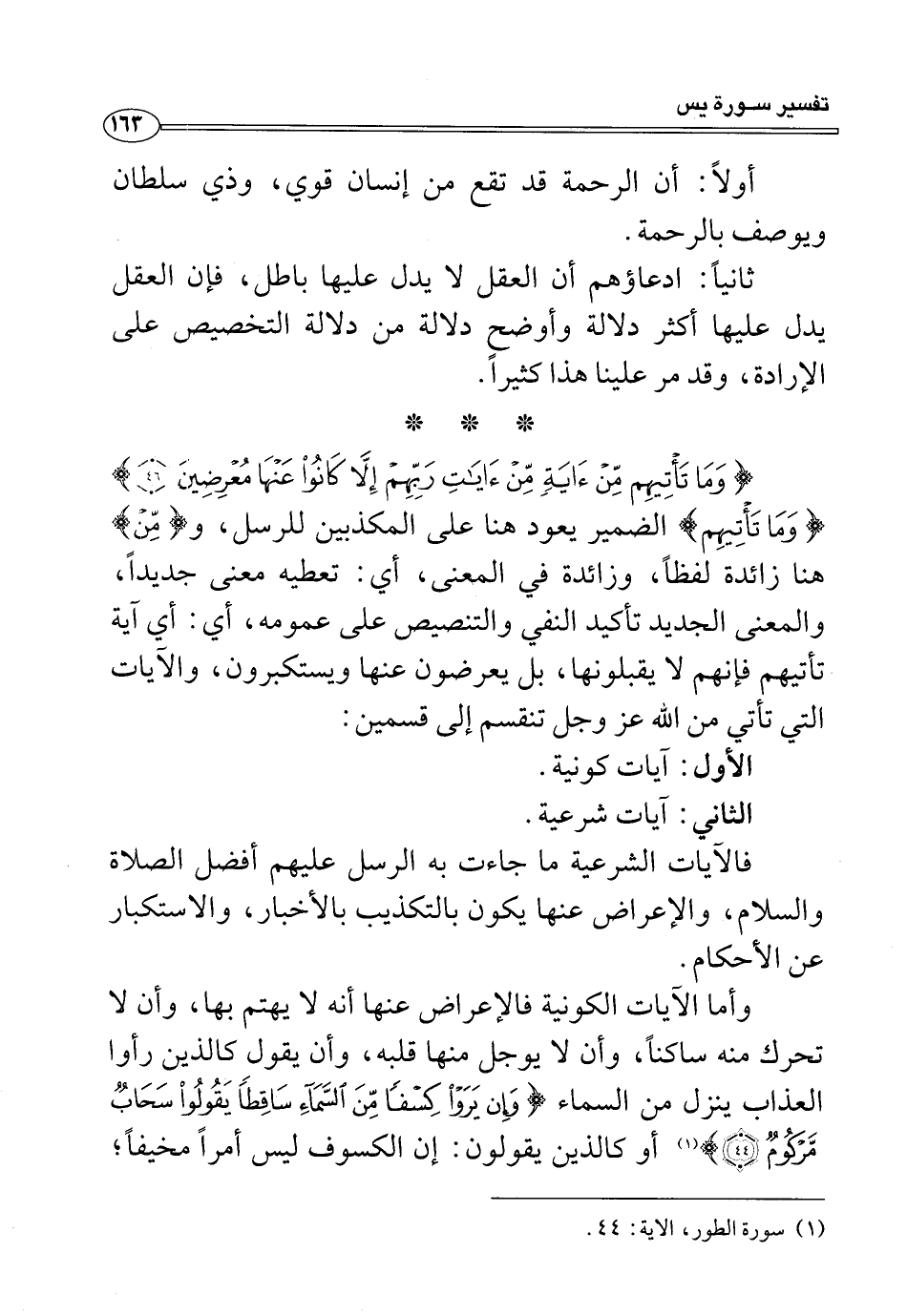 وأما الآيات الكونية فالإعراض عنها أنه لا يهتم بها، وأن لا تحرك منه ساكنًا، وأن لا يوجل منها قلبه، وأن يقول كالذين رأوا العذاب ينزل من السماء {وَإِنْ يَرَوْا كِسْفًا مِنَ السَّمَاءِ سَاقِطًا يَقُولُوا سَحَابٌ مَرْكُومٌ (٤٤)} (¬١) أو كالذين يقولون: إن الكسوف ليس أمرًا مخيفًا،
