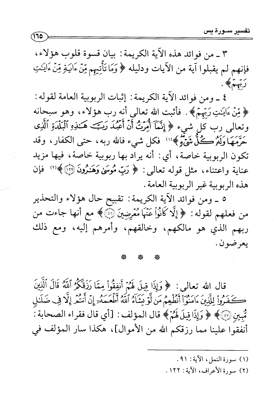 قال الله تعالى: {وَإِذَا قِيلَ لَهُمْ أَنْفِقُوا مِمَّا رَزَقَكُمُ اللَّهُ قَالَ الَّذِينَ كَفَرُوا لِلَّذِينَ آمَنُوا أَنُطْعِمُ مَنْ لَوْ يَشَاءُ اللَّهُ أَطْعَمَهُ إِنْ أَنْتُمْ إِلَّا فِي ضَلَالٍ مُبِينٍ (٤٧)} {وَإِذَا قِيلَ لَهُمْ} قال المؤلف: [أي قال فقراء الصحابة: أنفقوا علينا مما رزقكم الله من الأموال]، هكذا سار المؤلف في
