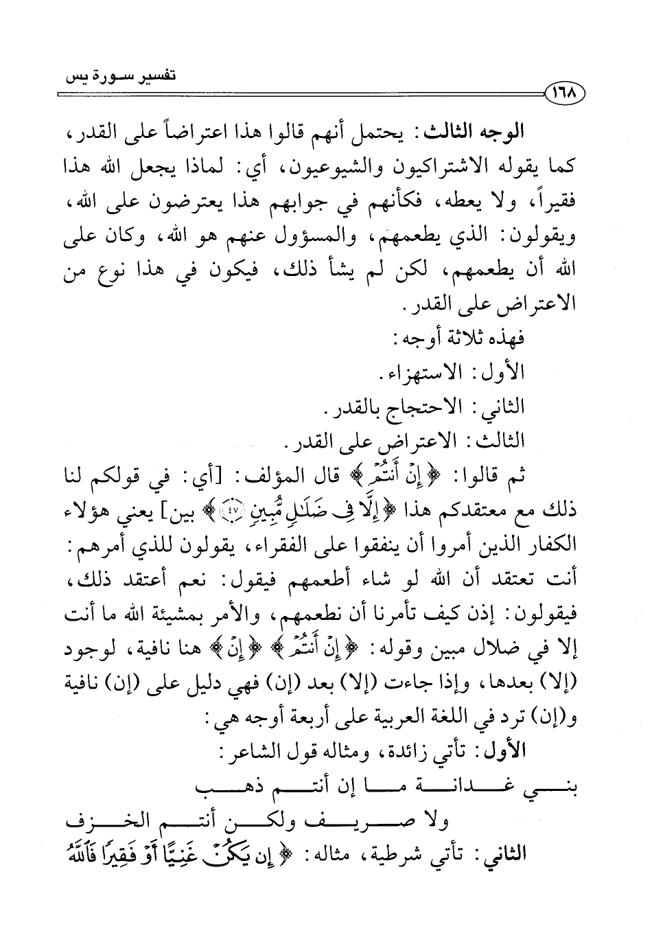 الوجه الثالث: يحتمل أنهم قالوا هذا اعتراضًا على القدر، كما يقوله الاشتراكيون والشيوعيون، أي: لماذا يجعل الله هذا فقيرًا، ولا يعطه، فكأنهم في جوابهم هذا يعترضون على الله، ويقولون: الذي يطعمهم، والمسؤول عنهم هو الله، وكان على الله أن يطعمهم، لكن لم يشأ ذلك، فيكون في هذا نوع من الاعتراض على القدر.