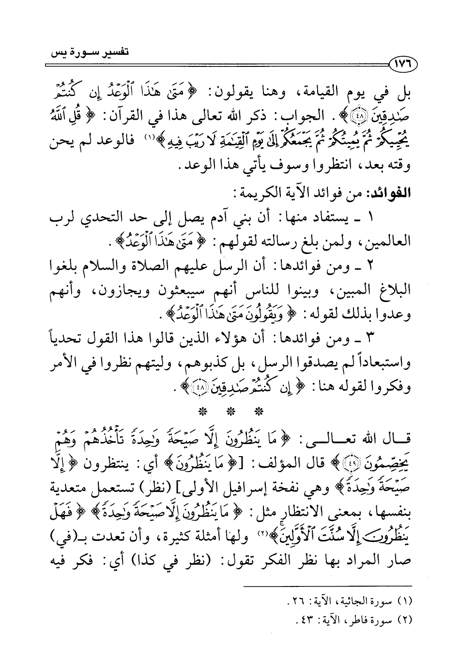 قال الله تعالى: {مَا يَنْظُرُونَ إِلَّا صَيْحَةً وَاحِدَةً تَأْخُذُهُمْ وَهُمْ يَخِصِّمُونَ (٤٩)} قال المؤلف: [{مَا يَنْظُرُونَ} أي: ينتظرون {إِلَّا صَيْحَةً وَاحِدَةً} وهي نفخة إسرافيل الأولى] (نظر) تستعمل متعدية بنفسها، بمعنى الانتظار مثل: {مَا يَنْظُرُونَ إِلَّا صَيْحَةً وَاحِدَةً} {فَهَلْ يَنْظُرُونَ إِلَّا سُنَّتَ الْأَوَّلِينَ} (¬٢) ولها أمثلة كثيرة، وأن تعدت بـ (في) صار المراد بها نظر الفكر تقول: (نظر في كذا) أي: فكر فيه