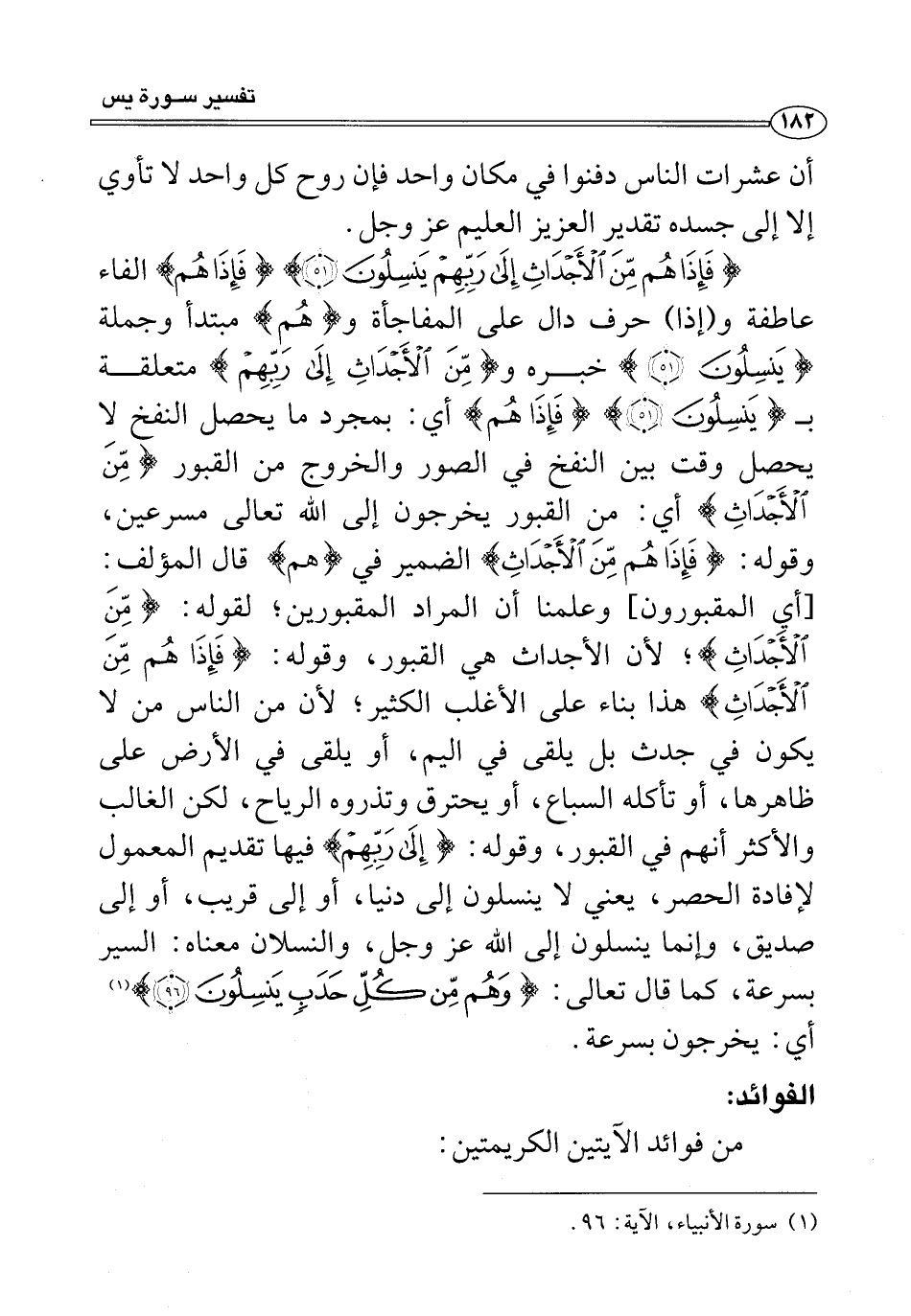 {وَنُفِخَ فِي الصُّورِ فَإِذَا هُمْ مِنَ الْأَجْدَاثِ إِلَى رَبِّهِمْ يَنْسِلُونَ (٥١)} {فَإِذَا هُمْ} الفاء عاطفة و (إذا) حرف دال على المفاجأة و {هُمْ} مبتدأ وجملة {يَنْسِلُونَ (٥١)} خبره و {مِنَ الْأَجْدَاثِ إِلَى رَبِّهِمْ} متعلقة بـ {يَنْسِلُونَ (٥١)} {فَإِذَا هُمْ} أي: بمجرد ما يحصل النفخ لا يحصل وقت بين النفخ في الصور والخروج من القبور {مِنَ الْأَجْدَاثِ} أي: من القبور يخرجون إلى الله تعالى مسرعين، وقوله: {فَإِذَا هُمْ مِنَ الْأَجْدَاثِ} الضمير في {هُمْ} قال المؤلف: [أي المقبورون] وعلمنا أن المراد المقبورين؛ لقوله: {مِنَ الْأَجْدَاثِ}؛ لأن الأجداث هي القبور، وقوله: {فَإِذَا هُمْ مِنَ الْأَجْدَاثِ} هذا بناء على الأغلب الكثير؛ لأن من الناس من لا يكون في جدث بل يلقى في اليم، أو يلقى في الأرض على ظاهرها، أو تأكله السباع، أو يحترق وتذروه الرياح، لكن الغالب والأكثر أنهم في القبور، وقوله: {إِلَى رَبِّهِمْ} فيها تقديم المعمول لإفادة الحصر، يعني لا ينسلون إلى دنيا، أو إلى قريب، أو إلى صديق، وإنما ينسلون إلى الله عز وجل، والنسلان معناه: السير بسرعة، كما قال تعالى: {وَهُمْ مِنْ كُلِّ حَدَبٍ يَنْسِلُونَ (٩٦)} (¬١) أي: يخرجون بسرعة.