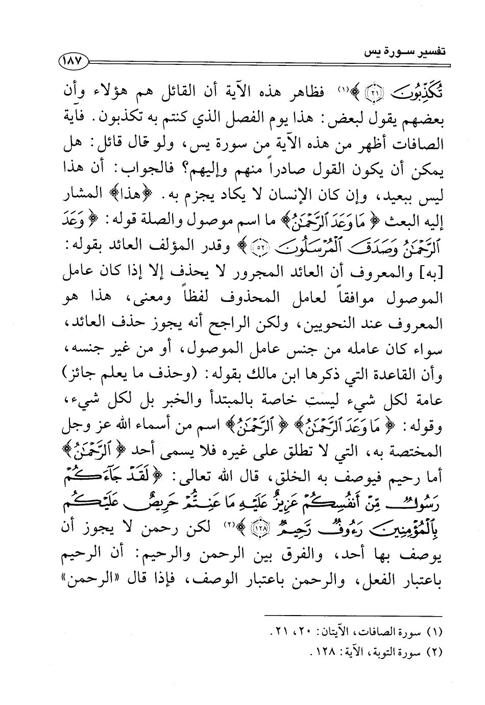 تُكَذِّبُونَ (٢١)} (¬١) فظاهر هذه الآية أن القائل هم هؤلاء وأن بعضهم يقول لبعض: هذا يوم الفصل الذي كنتم به تكذبون. فآية الصافات أظهر من هذه الآية من سورة يس، ولو قال قائل: هل يمكن أن يكون القول صادرًا منهم وإليهم؟ فالجواب: أن هذا ليس ببعيد، وإن كان الإنسان لا يكاد يجزم به. {هَذَا} المشار إليه البعث {مَا وَعَدَ الرَّحْمَنُ} ما اسم موصول والصلة قوله: {وَعَدَ الرَّحْمَنُ وَصَدَقَ الْمُرْسَلُونَ (٥٢)} وقدر المؤلف العائد بقوله: [به] والمعروف أن العائد المجرور لا يحذف إلا إذا كان عامل الموصول موافقًا لعامل المحذوف لفظًا ومعنى، هذا هو المعروف عند النحويين، ولكن الراجح أنه يجوز حذف العائد، سواء كان عامله من جنس عامل الموصول، أو من غير جنسه، وأن القاعدة التي ذكرها ابن مالك بقوله: (وحذف ما يعلم جائز) عامة لكل شيء ليست خاصة بالمبتدأ والخبر بل لكل شيء، وقوله: {مَا وَعَدَ الرَّحْمَنُ} {الرَّحْمَنُ} اسم من أسماء الله عز وجل المختصة به، التي لا تطلق على غيره فلا يسمى أحد {الرَّحْمَنُ} أما رحيم فيوصف به الخلق، قال الله تعالى: {لَقَدْ جَاءَكُمْ رَسُولٌ مِنْ أَنْفُسِكُمْ عَزِيزٌ عَلَيْهِ مَا عَنِتُّمْ حَرِيصٌ عَلَيْكُمْ بِالْمُؤْمِنِينَ رَءُوفٌ رَحِيمٌ (١٢٨)} (¬٢) لكن رحمن لا يجوز أن يوصف بها أحد، والفرق بين الرحمن والرحيم: أن الرحيم باعتبار الفعل، والرحمن باعتبار الوصف، فإذا قال "الرحمن"