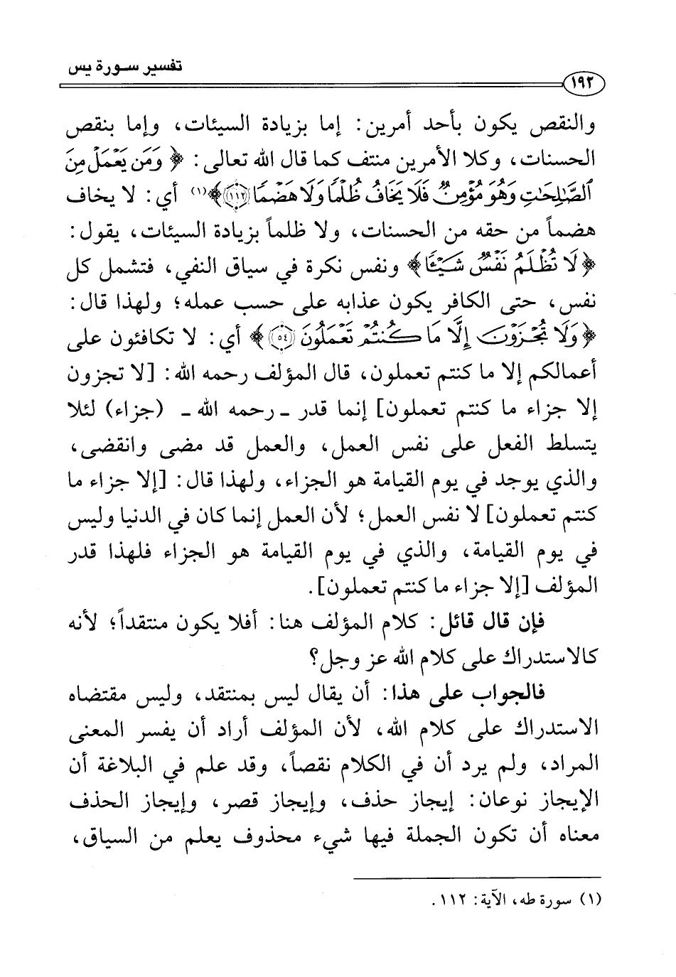 والنقص يكون بأحد أمرين: إما بزيادة السيئات، وإما بنقص الحسنات، وكلا الأمرين منتف كما قال الله تعالى: {وَمَنْ يَعْمَلْ مِنَ الصَّالِحَاتِ وَهُوَ مُؤْمِنٌ فَلَا يَخَافُ ظُلْمًا وَلَا هَضْمًا (١١٢)} (¬١) أي: لا يخاف هضمًا من حقه من الحسنات، ولا ظلمًا بزيادة السيئات، يقول: {لَا تُظْلَمُ نَفْسٌ شَيْئًا} ونفس نكرة في سياق النفي، فتشمل كل نفس، حتى الكافر يكون عذابه على حسب عمله، ولهذا قال: {وَلَا تُجْزَوْنَ إِلَّا مَا كُنْتُمْ تَعْمَلُونَ (٥٤)} أي: لا تكافئون على أعمالكم إلا ما كنتم تعملون، قال المؤلف رحمه الله: [لا تجزون إلا جزاء ما كنتم تعملون] إنما قدر -رحمه الله- (جزاء) لئلا يتسلط الفعل على نفس العمل، والعمل قد مضى وانقضى، والذي يوجد في يوم القيامة هو الجزاء، ولهذا قال: [إلا جزاء ما كنتم تعملون] لا نفس العمل؛ لأن العمل إنما كان في الدنيا وليس في يوم القيامة، والذي في يوم القيامة هو الجزاء فلهذا قدر المؤلف [إلا جزاء ما كنتم تعملون].