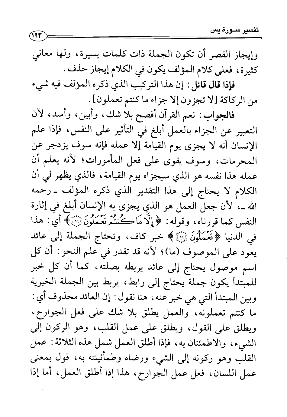 فالجواب: نعم القرآن أفصح بلا شك، وأبين، وأسد، لأن التعبير عن الجزاء بالعمل أبلغ في التأثير على الففس، فإذا علم الإنسان أنه لا يجزى يوم القيامة إلا عمله فإنه سوف يزدجر عن المحرمات، وسوف يقوى على فعل المأمورات؛ لأنه يعلم أن عمله هذا نفسه هو الذي سيجزاه يوم القيامة، فالذي يظهر لي أن الكلام لا يحتاج إلى هذا التقدير الذي ذكره المؤلف -رحمه الله-، لأن جعل العمل هو الذي يجزى به الإنسان أبلغ في إثارة النفس كما قررناه، وقوله: {إِلَّا مَا كُنْتُمْ تَعْمَلُونَ (٥٤)} أي: هذا في الدنيا {تَعْمَلُونَ (٥٤)} خبر كاف، وتحتاج الجملة إلى عائد يعود على الموصوف (ما)؛ لأنه قد تقدر في علم النحو: أن كل اسم موصول يحتاج إلى عائد يربطه بصلته، كما أن كل خبر للمبتدأ يكون جملة يحتاج إلى رابط، يربط بين الجملة الخبرية وبين المبتدأ التي هي خبر عنه، هنا نقول: إن العائد محذوف أي: ما كنتم تعملونه، والعمل يطلق بلا شك على فعل الجوارح، ويطلق على القول، ويطلق على عمل القلب، وهو الركون إلى الشيء، والاطمئنان به، فإذا أطلق العمل شمل هذه الثلاثة: عمل القلب وهو ركونه إلى الشيء ورضاه وطمأنينته به، قول بمعنى عمل اللسان، فعل عمل الجوارح، هذا إذا أطلق العمل، أما إذا